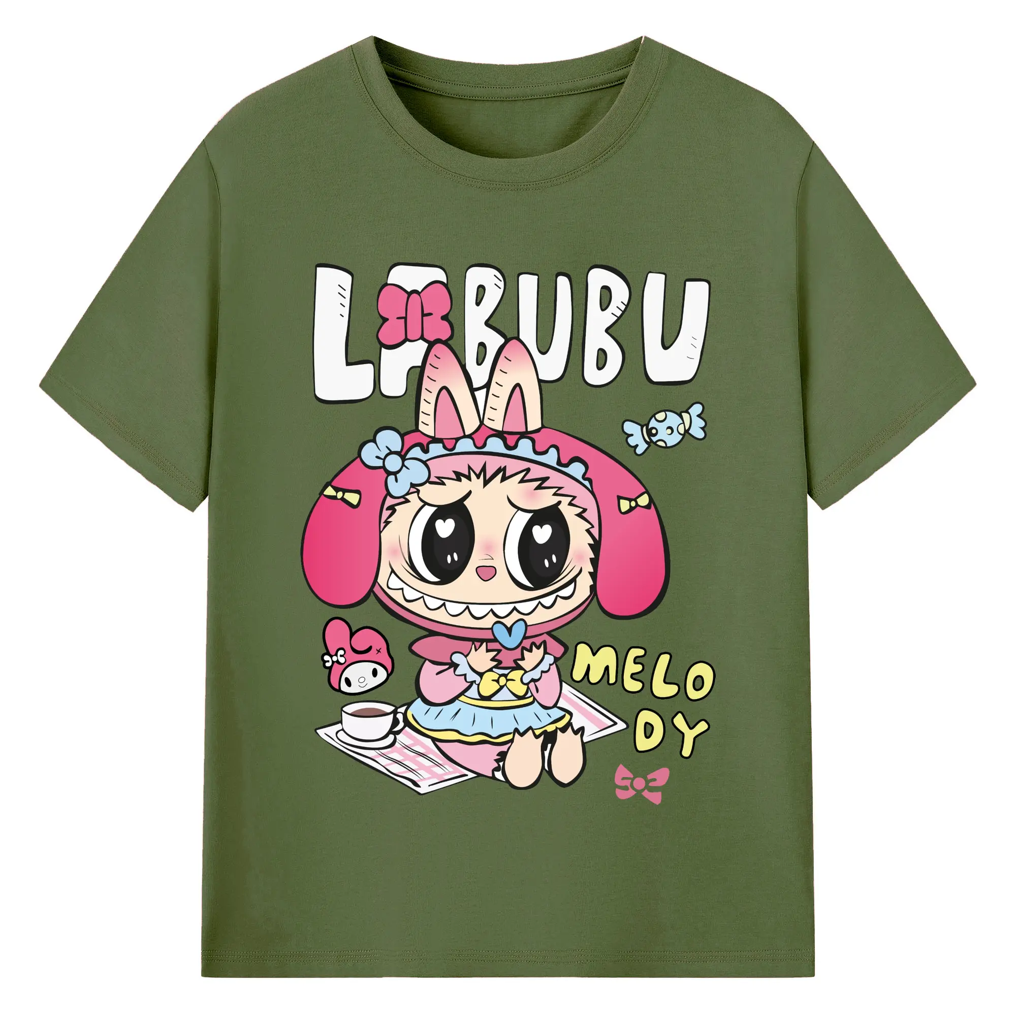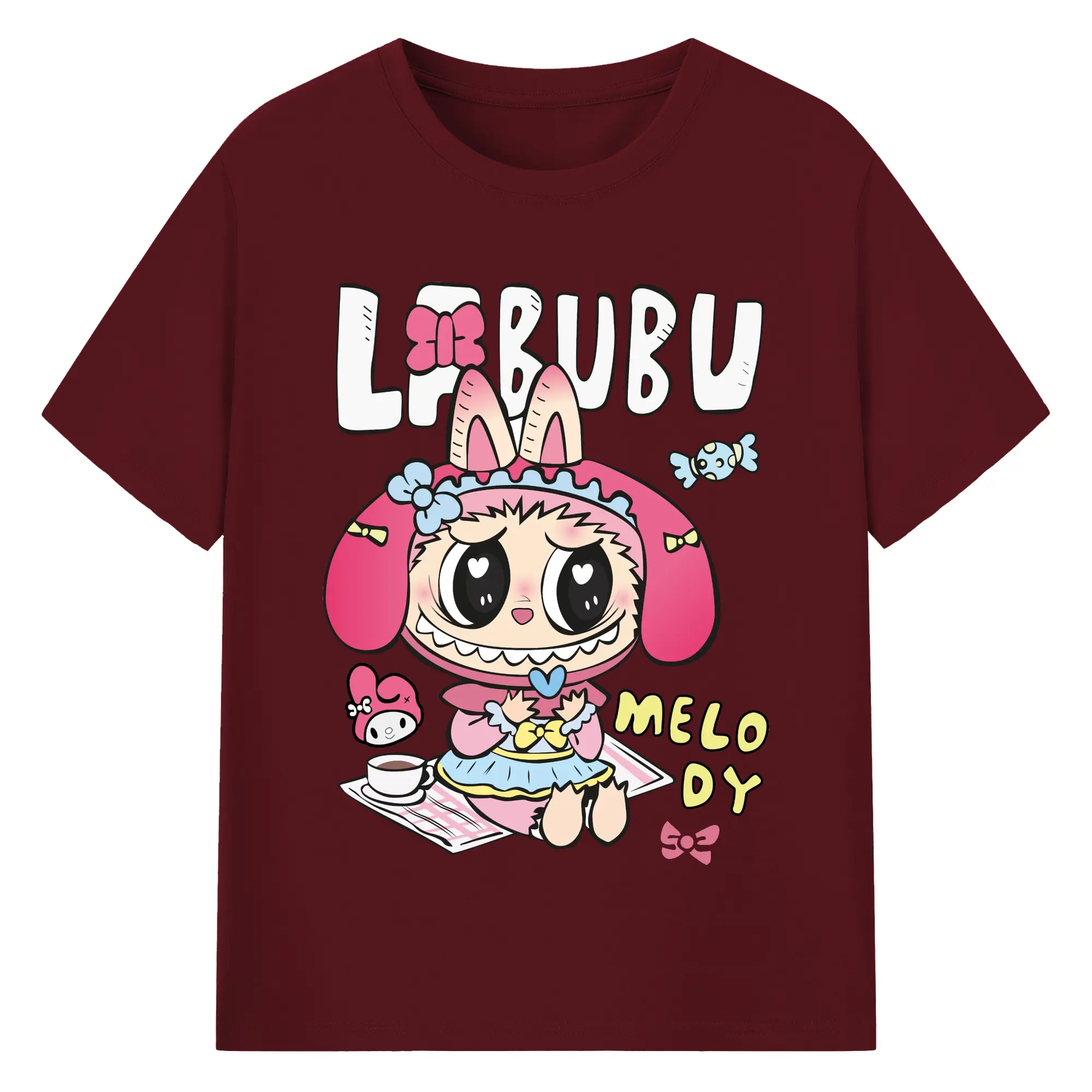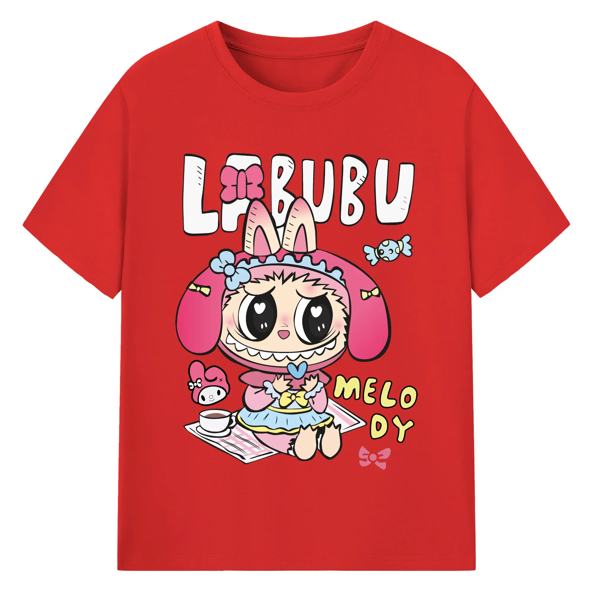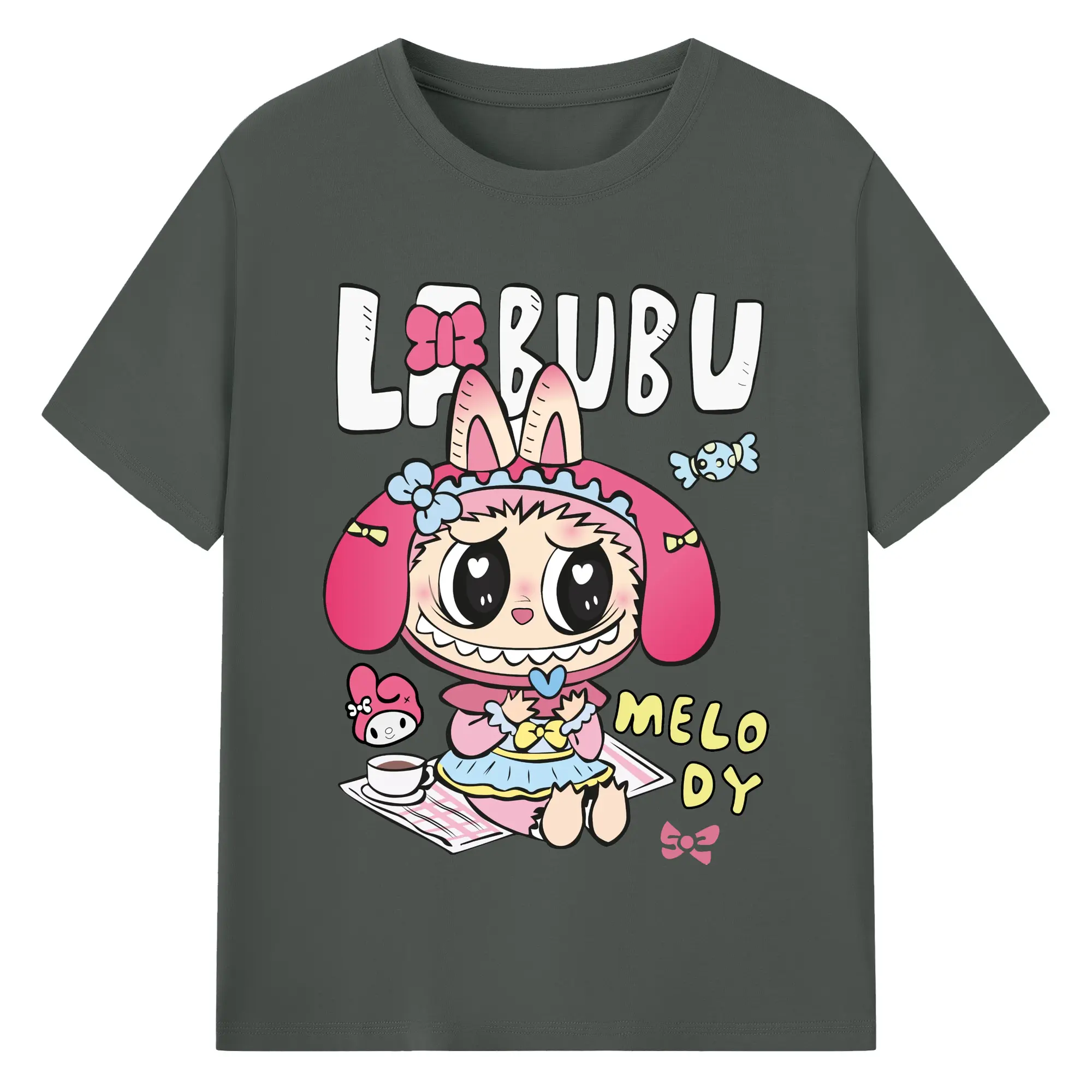 【限定】サンリオマイメロディ × ラブブ コラボ - 綿100% ヴィンテージ風 半袖Tシャツ ・ フロントプリント ・ 柔らか肌触り ・ 通気性 快適 ・ スポーツ カジュアル 外出用