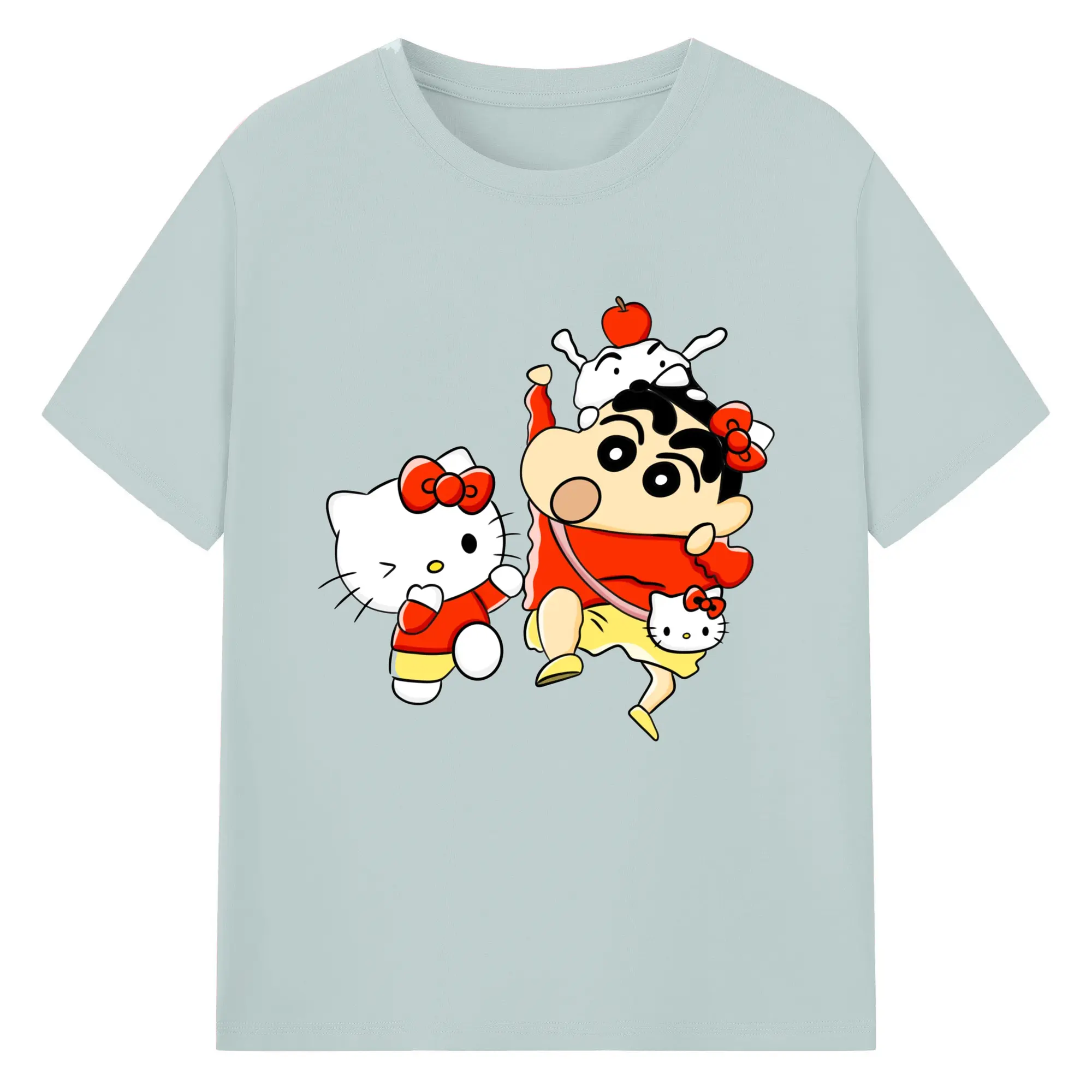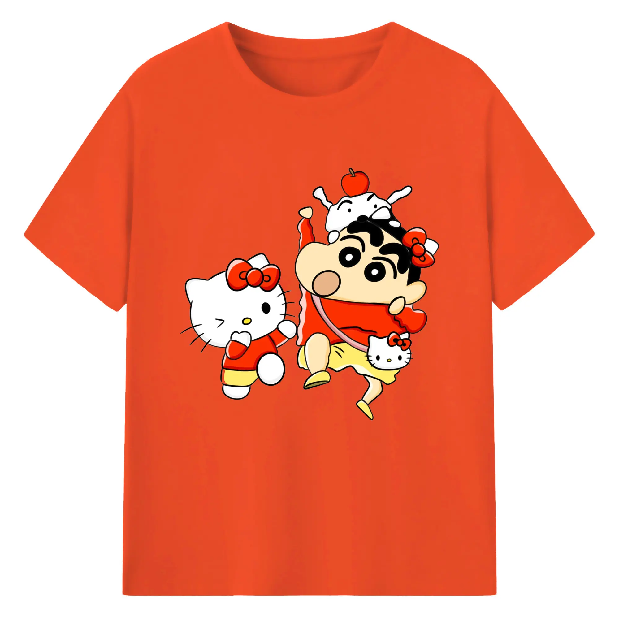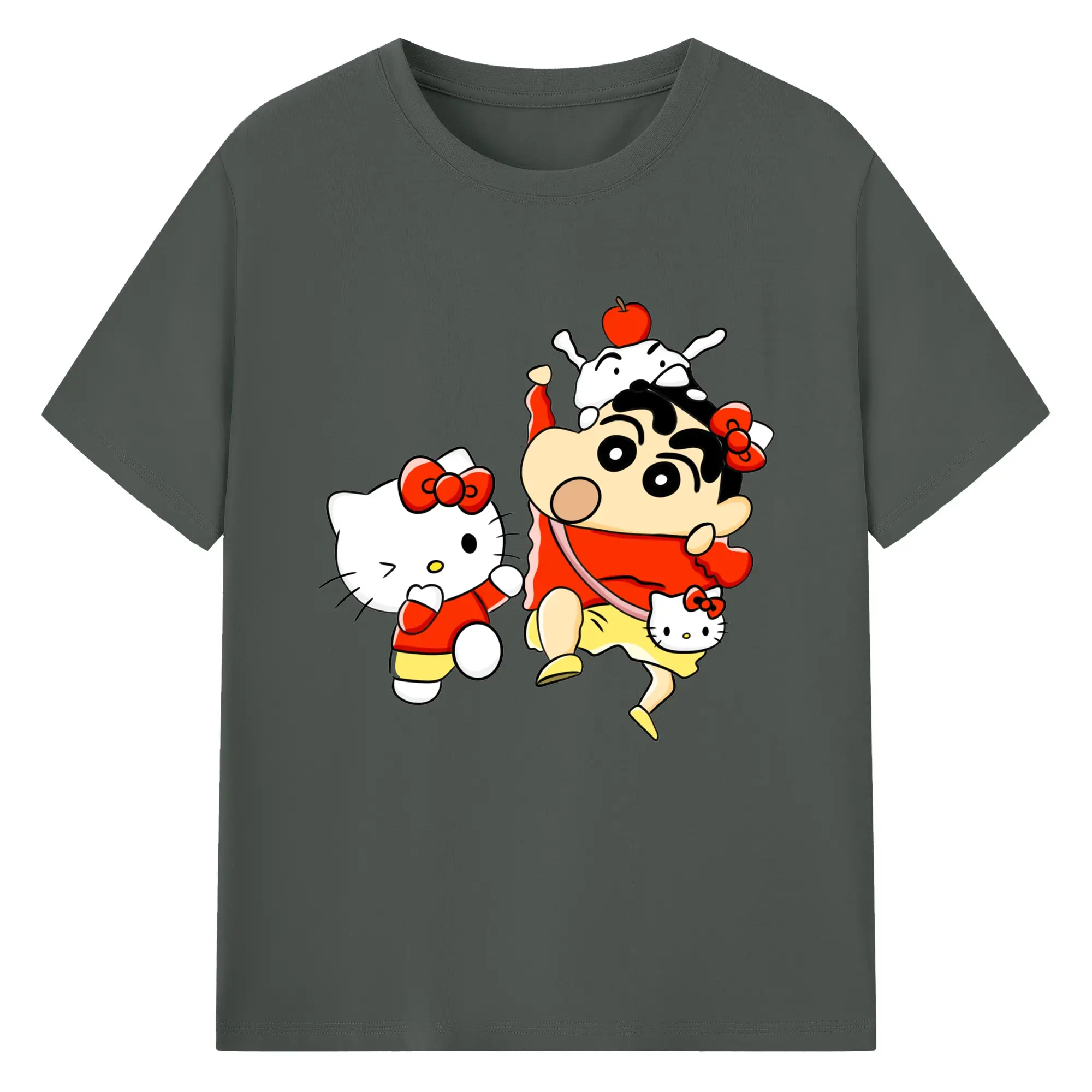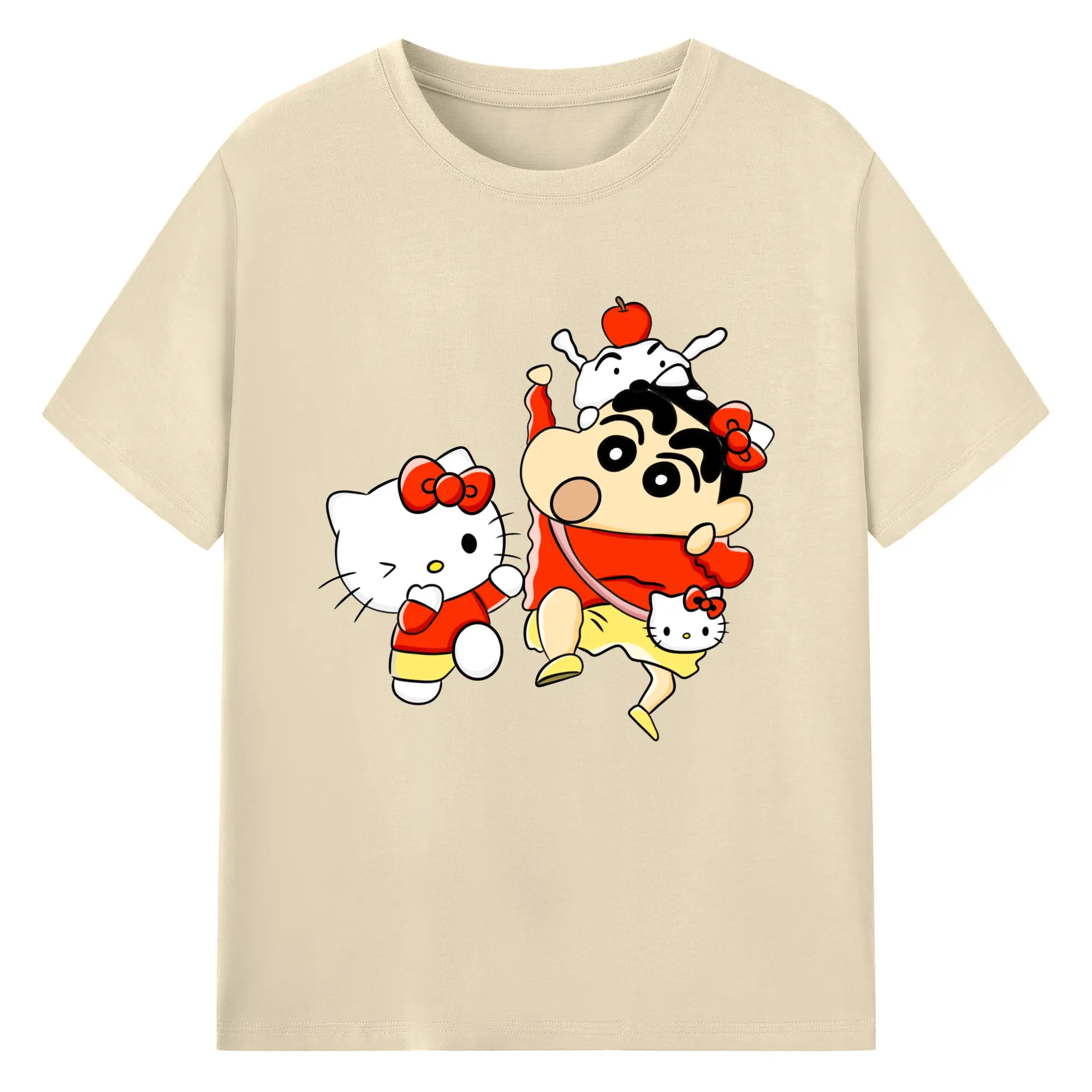 2025クレヨンしんちゃん × ハローキティ 限定コラボ - 綿100% ヴィンテージ風 半袖Tシャツ ・ フロントプリント ・ 柔らか肌触り ・ 通気性 快適 ・ スポーツ カジュアル 外出用