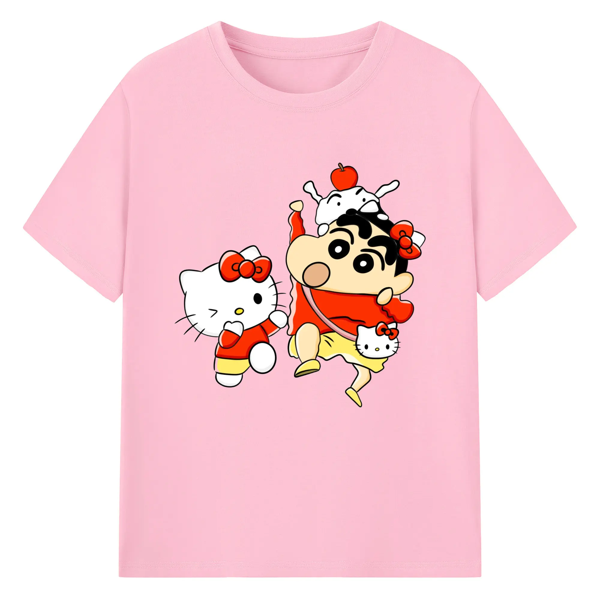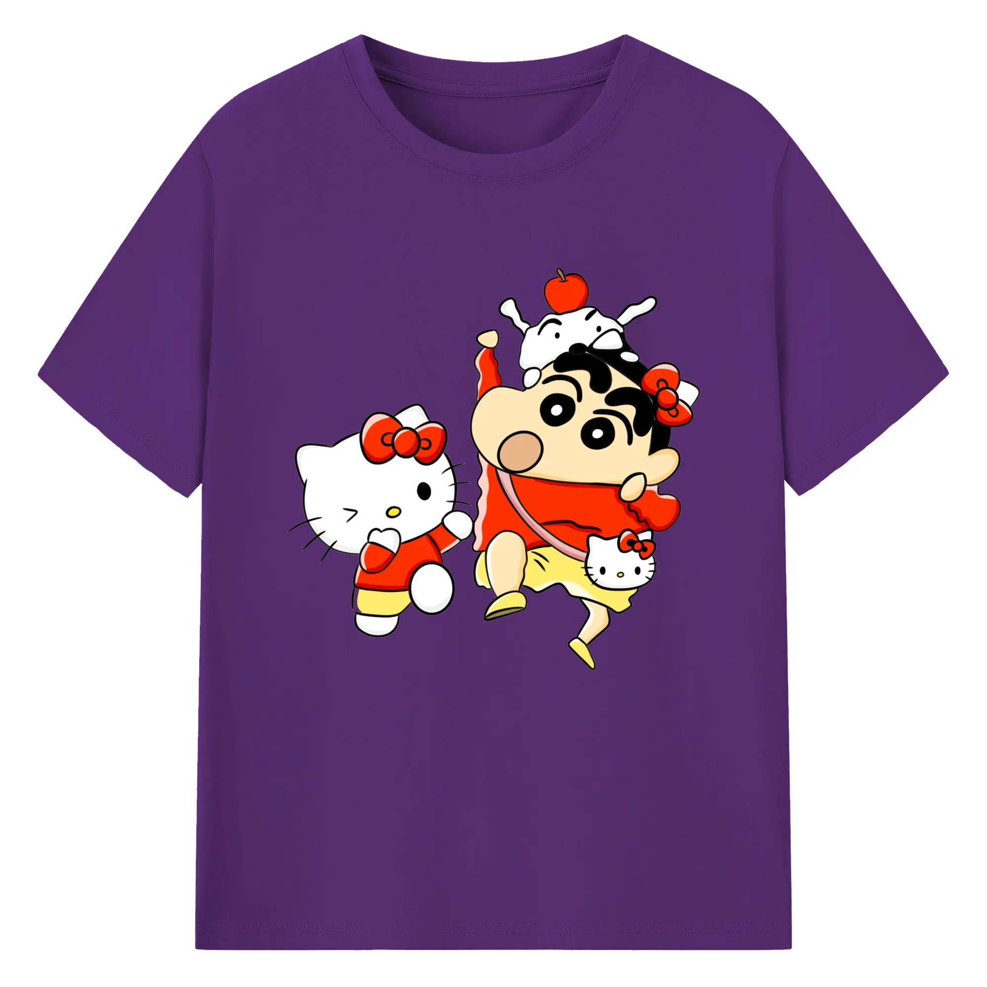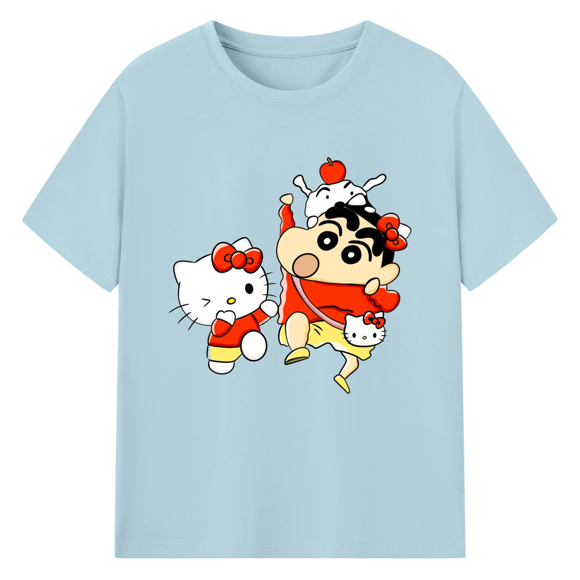 2025クレヨンしんちゃん × ハローキティ 限定コラボ - 綿100% ヴィンテージ風 半袖Tシャツ ・ フロントプリント ・ 柔らか肌触り ・ 通気性 快適 ・ スポーツ カジュアル 外出用