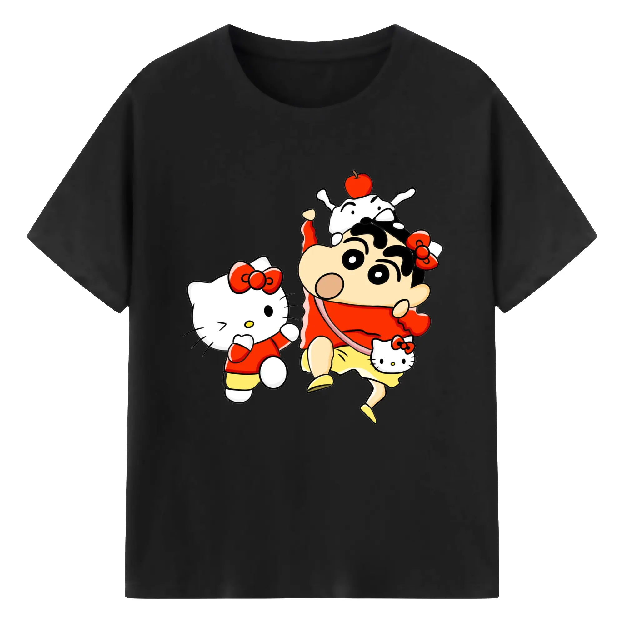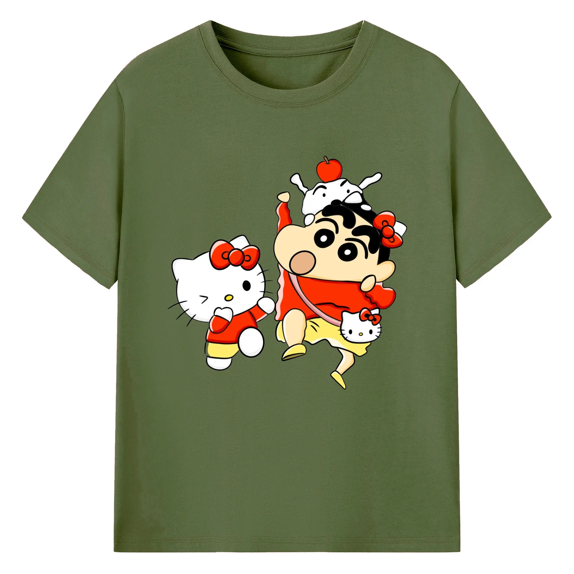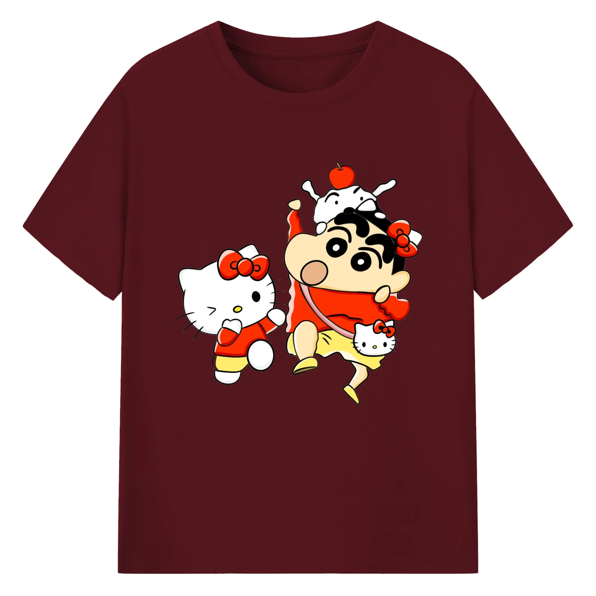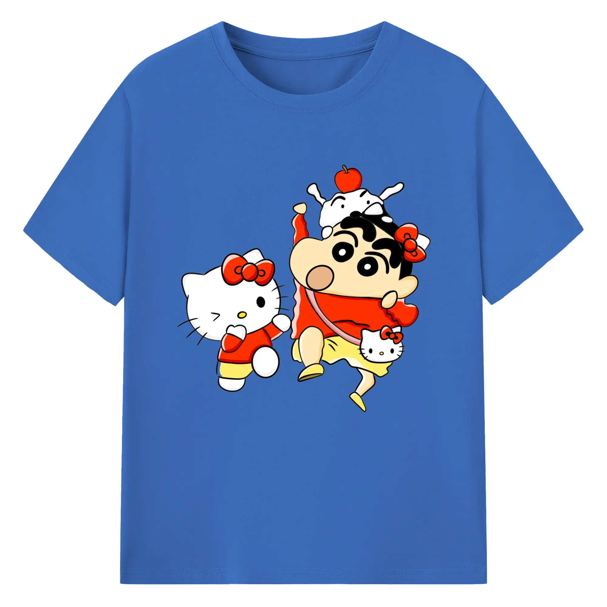 2025クレヨンしんちゃん × ハローキティ 限定コラボ - 綿100% ヴィンテージ風 半袖Tシャツ ・ フロントプリント ・ 柔らか肌触り ・ 通気性 快適 ・ スポーツ カジュアル 外出用