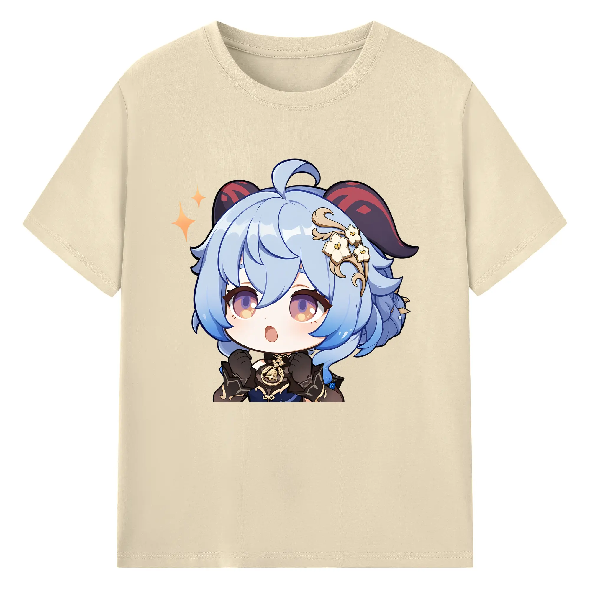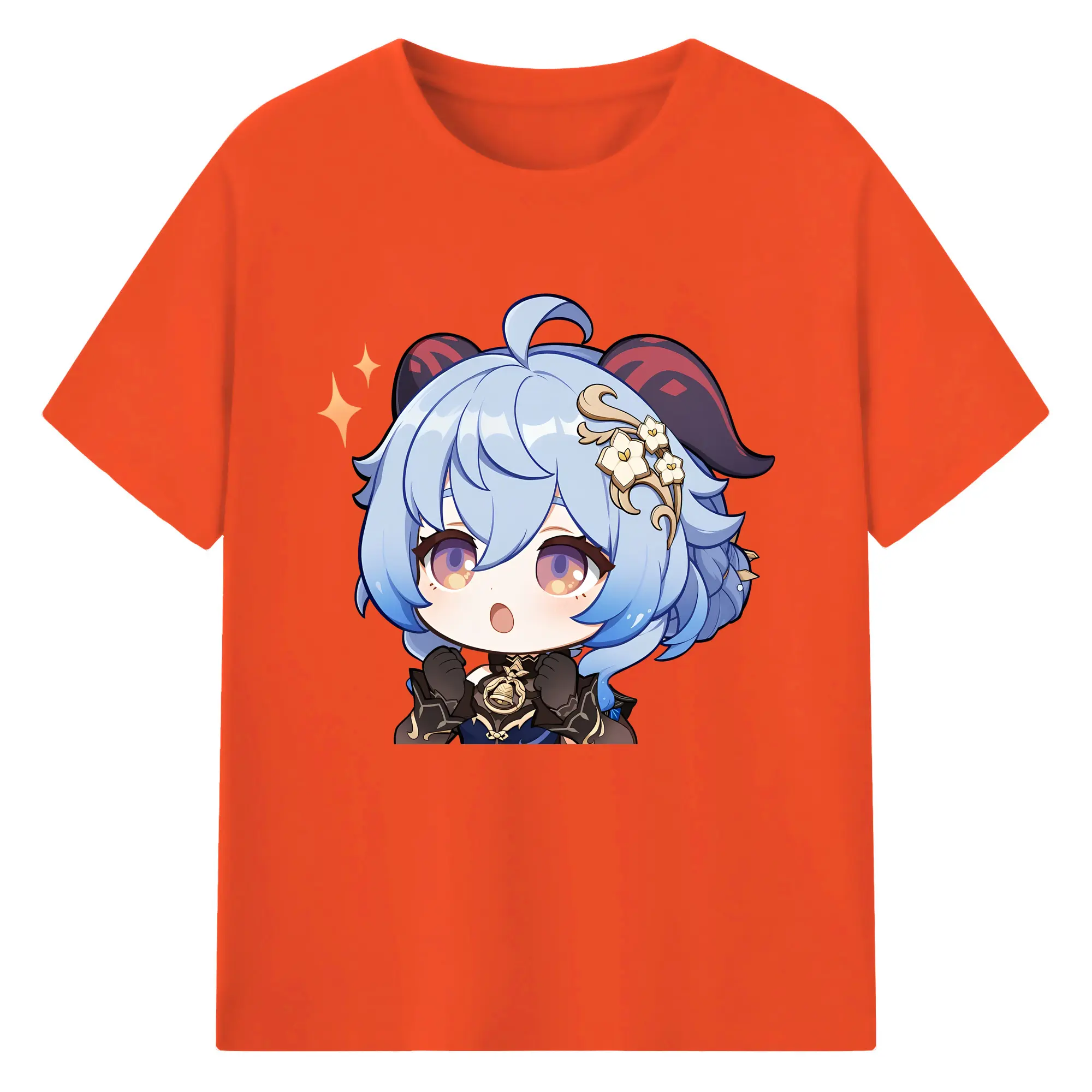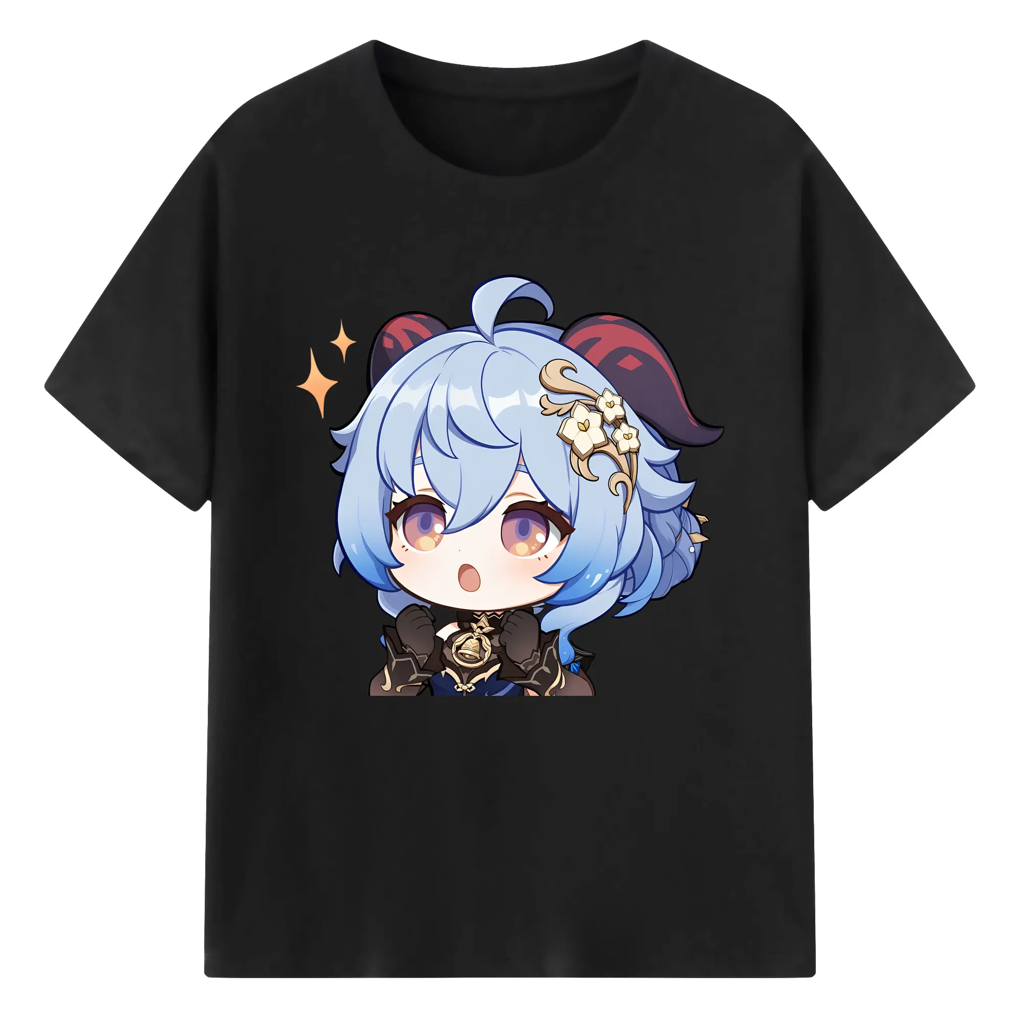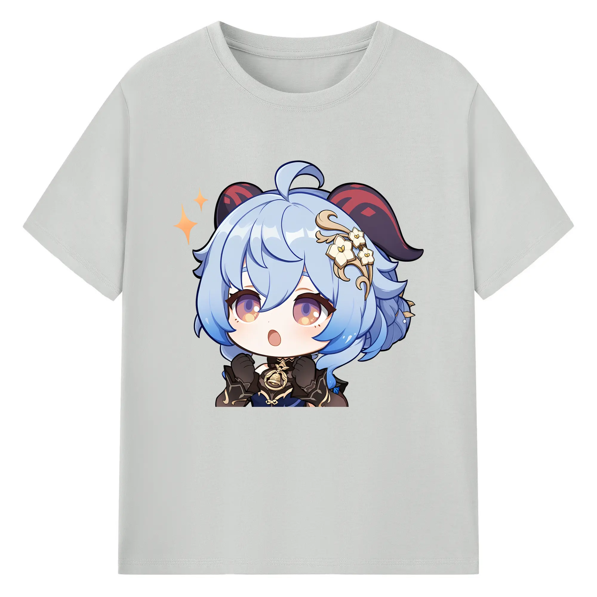 Genshin Impact 甘雨 Q版キャラクター 可愛いファングッズ - 綿100% ヴィンテージ風 半袖Tシャツ ・ フロントプリント ・ 柔らか肌触り ・ 通気性 快適 ・ スポーツ カジュアル 外出用