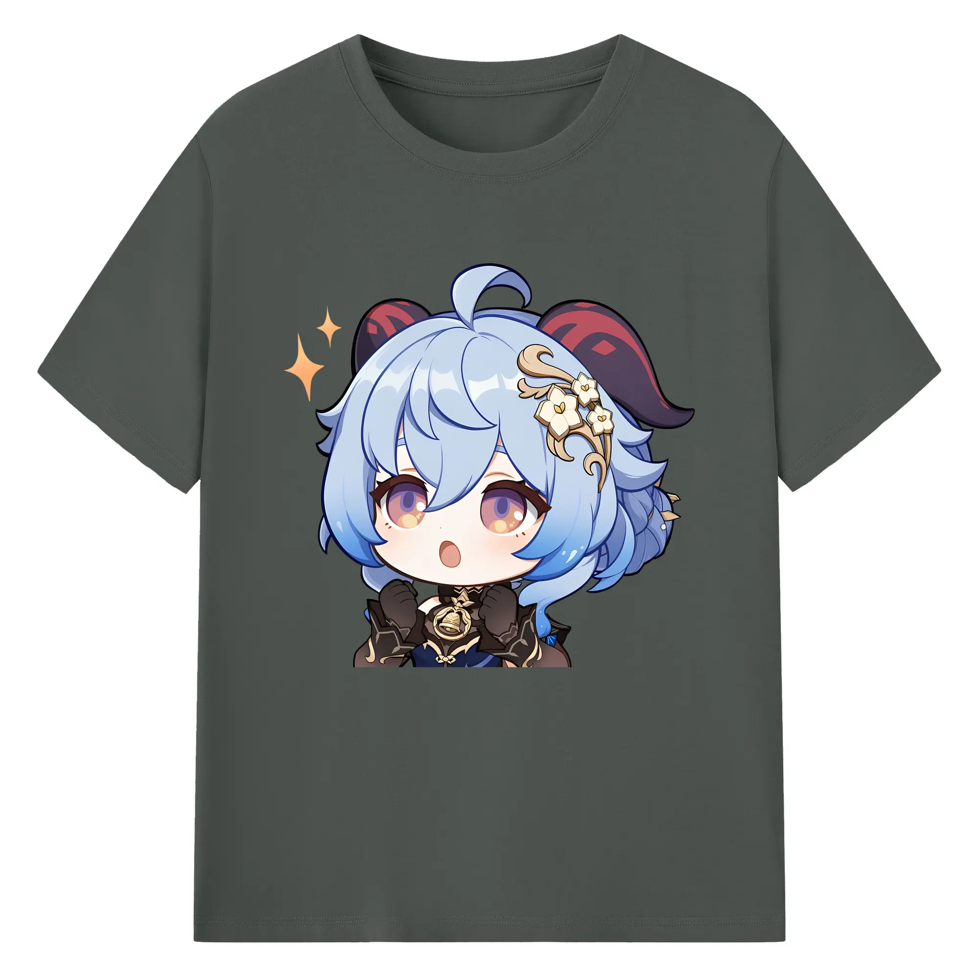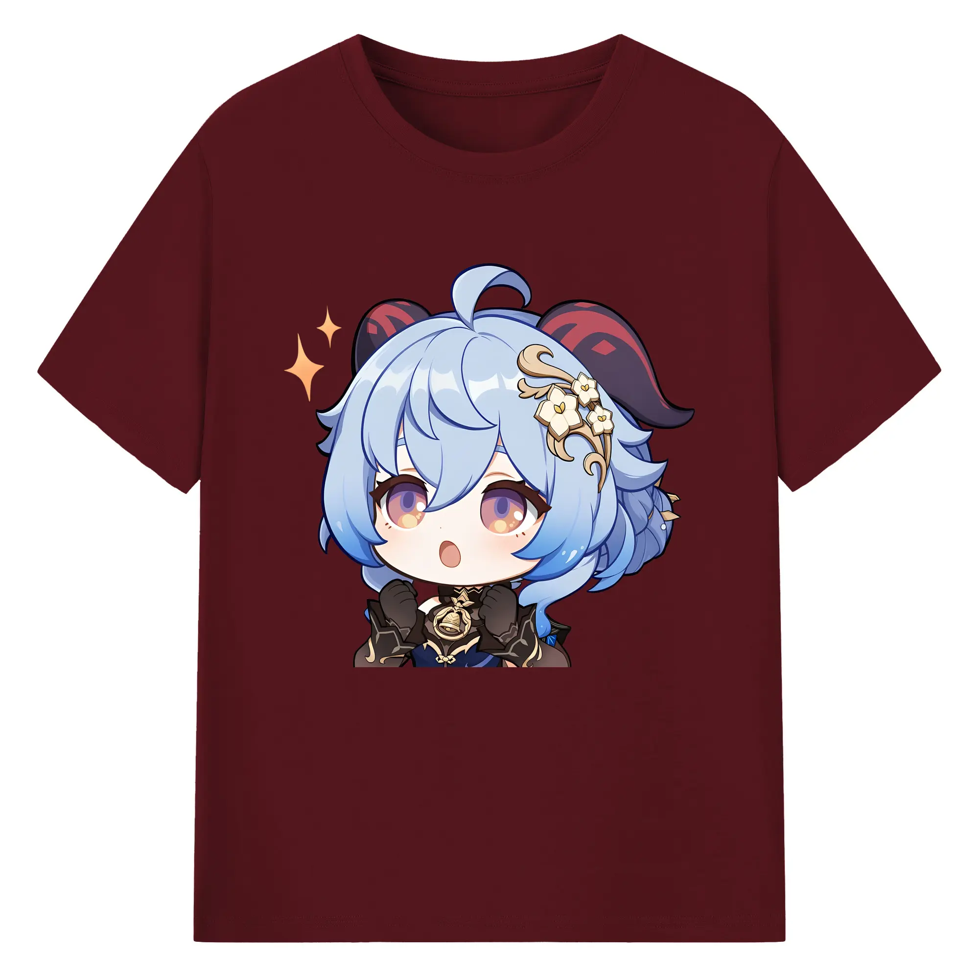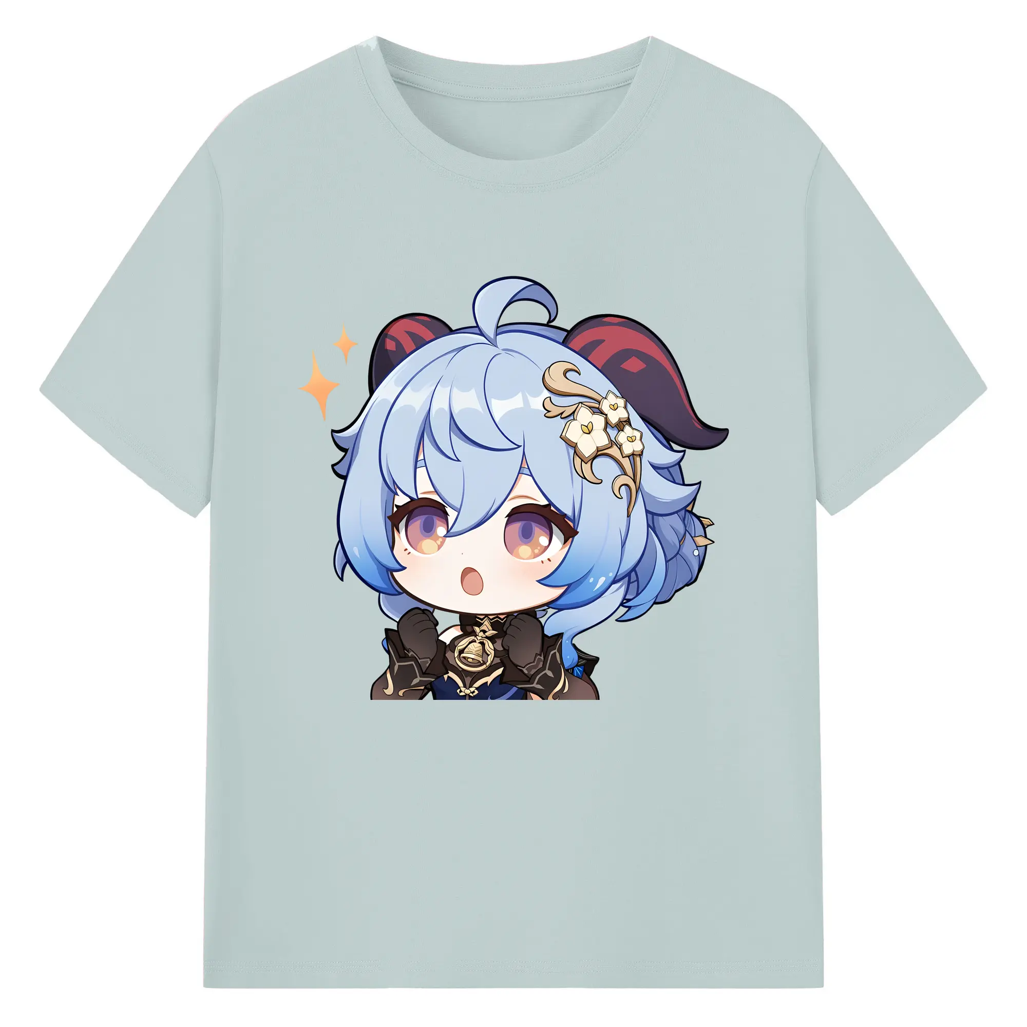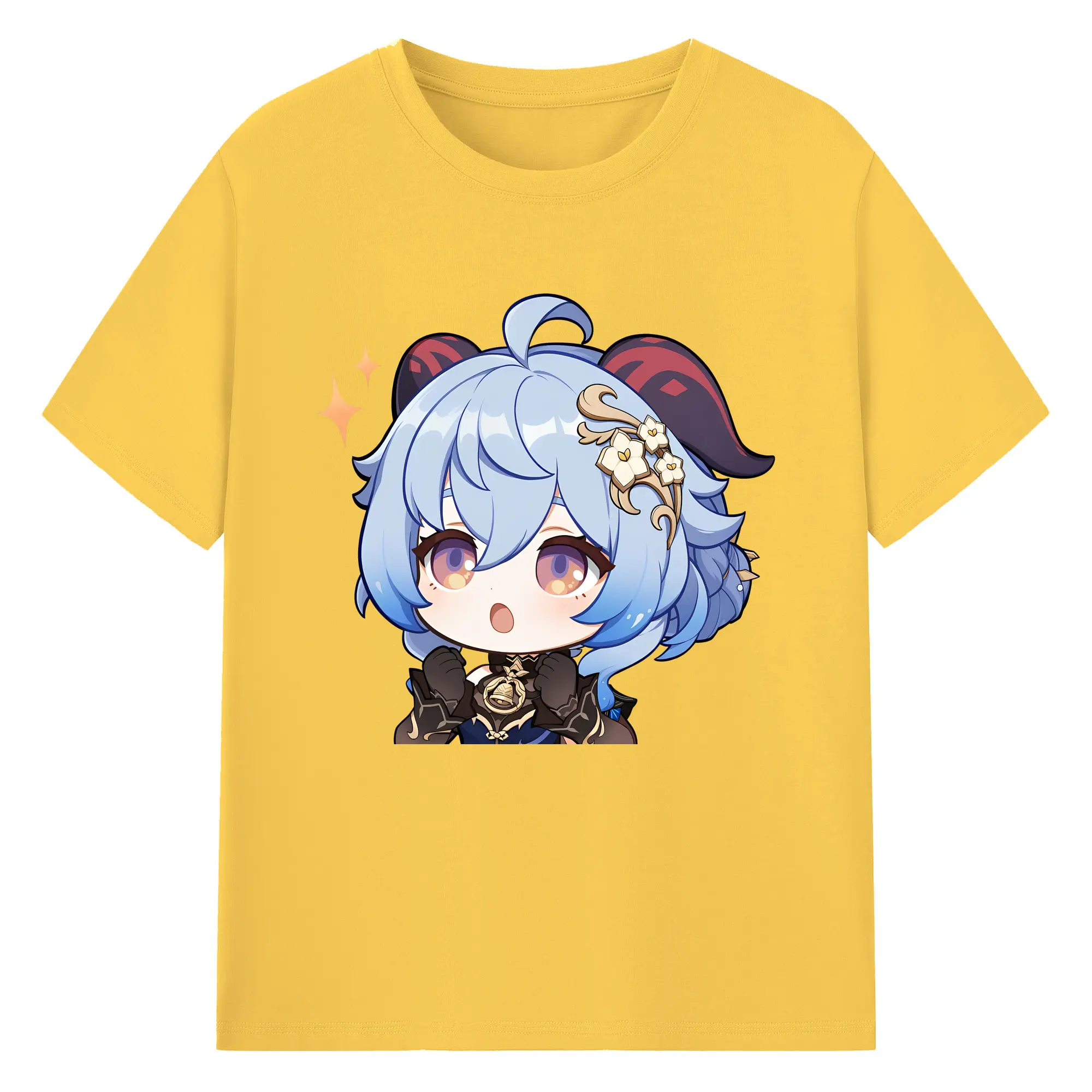 Genshin Impact 甘雨 Q版キャラクター 可愛いファングッズ - 綿100% ヴィンテージ風 半袖Tシャツ ・ フロントプリント ・ 柔らか肌触り ・ 通気性 快適 ・ スポーツ カジュアル 外出用