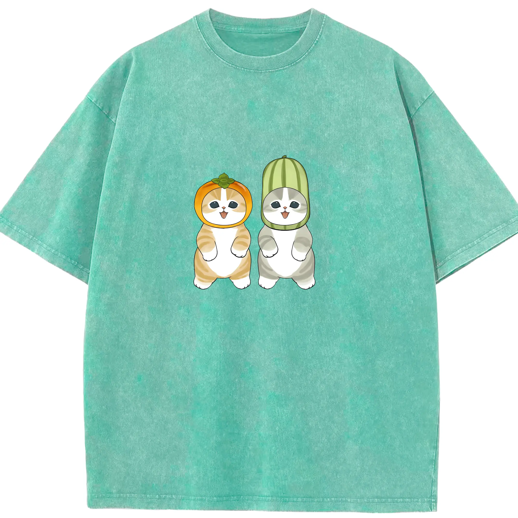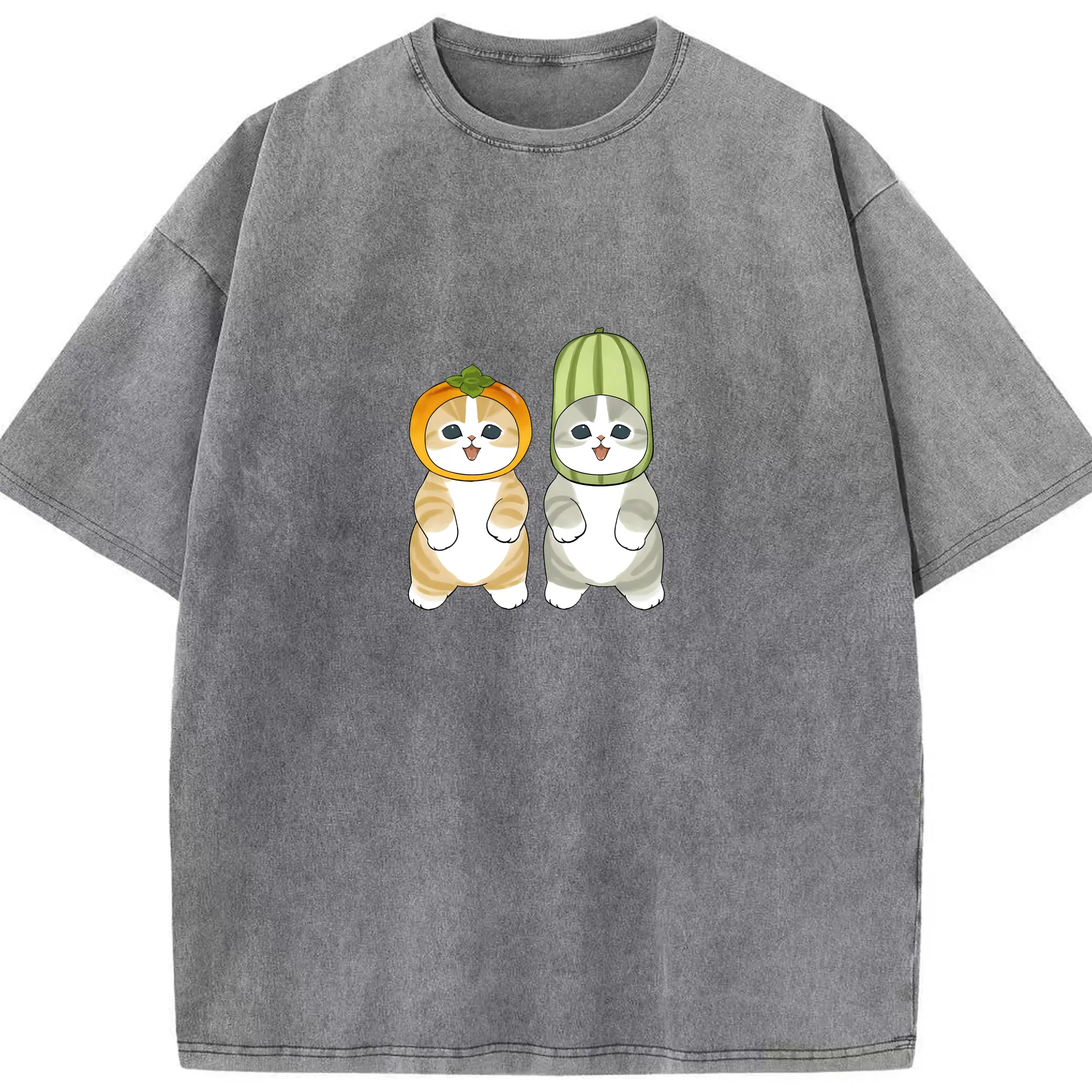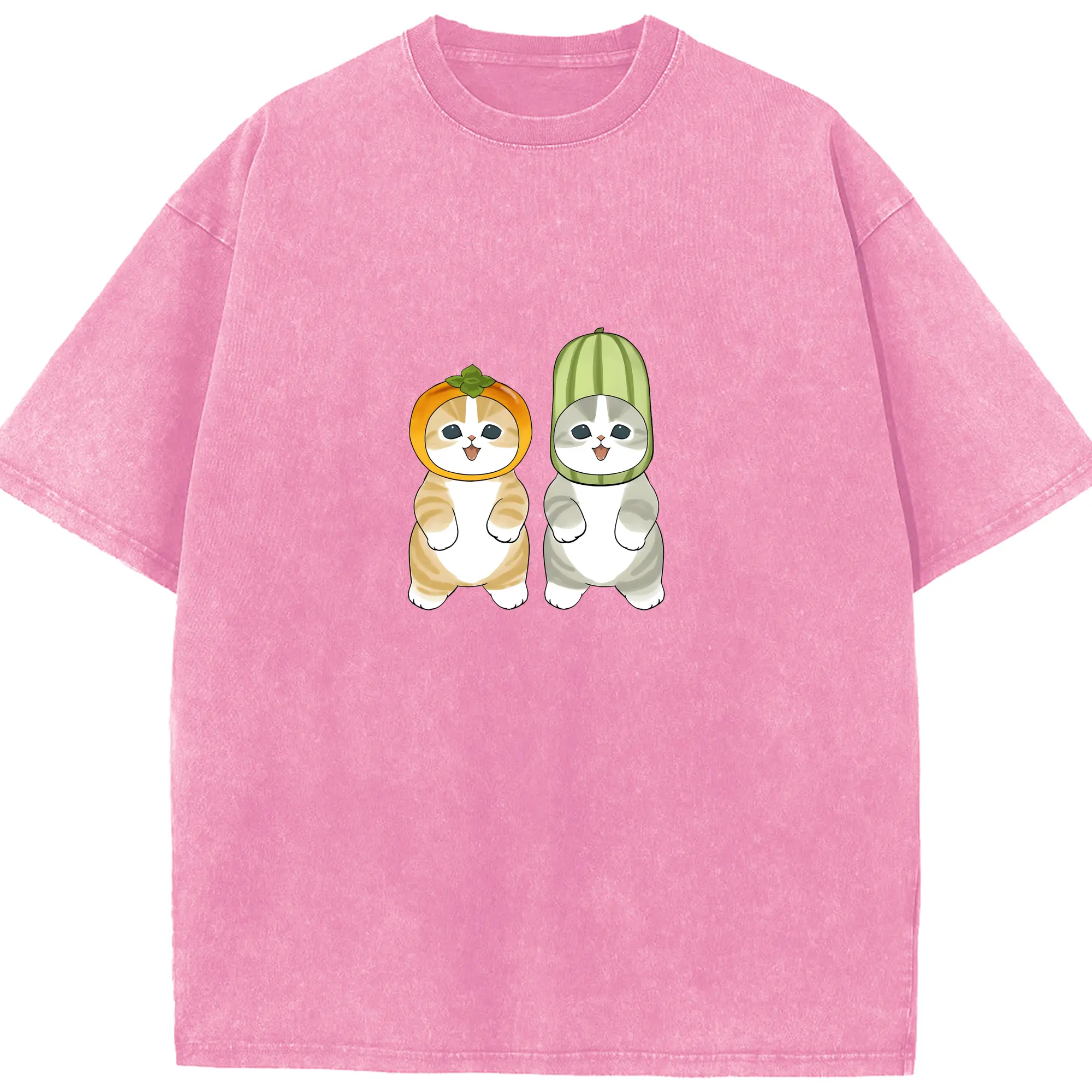 Mofusand柿とスイカ猫のユニーク - 綿100% 半袖Tシャツ ・ フロントプリント ・ 快適 通気性 ・ 日常使い 散歩 スポーツ用