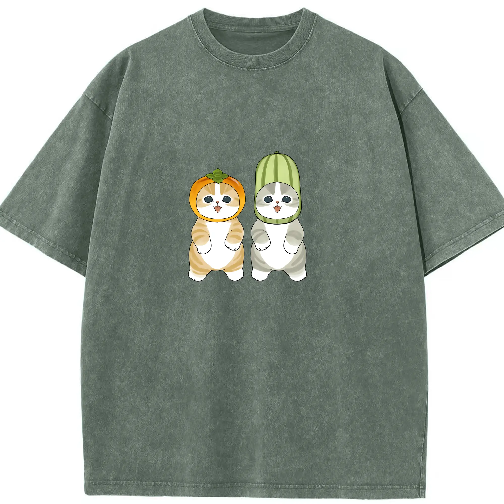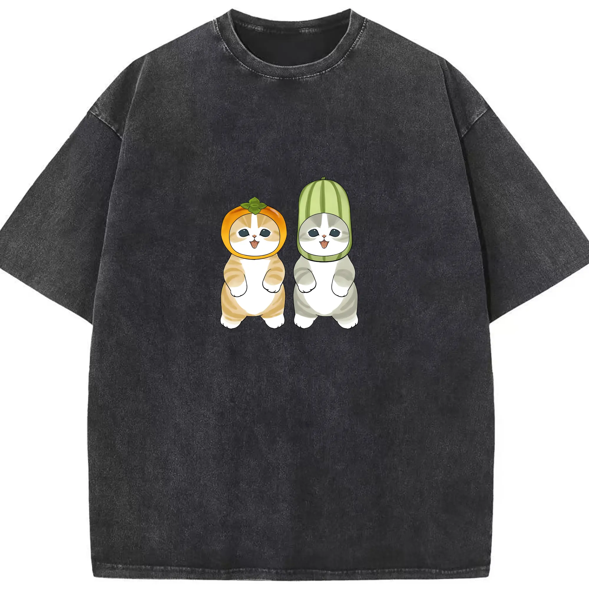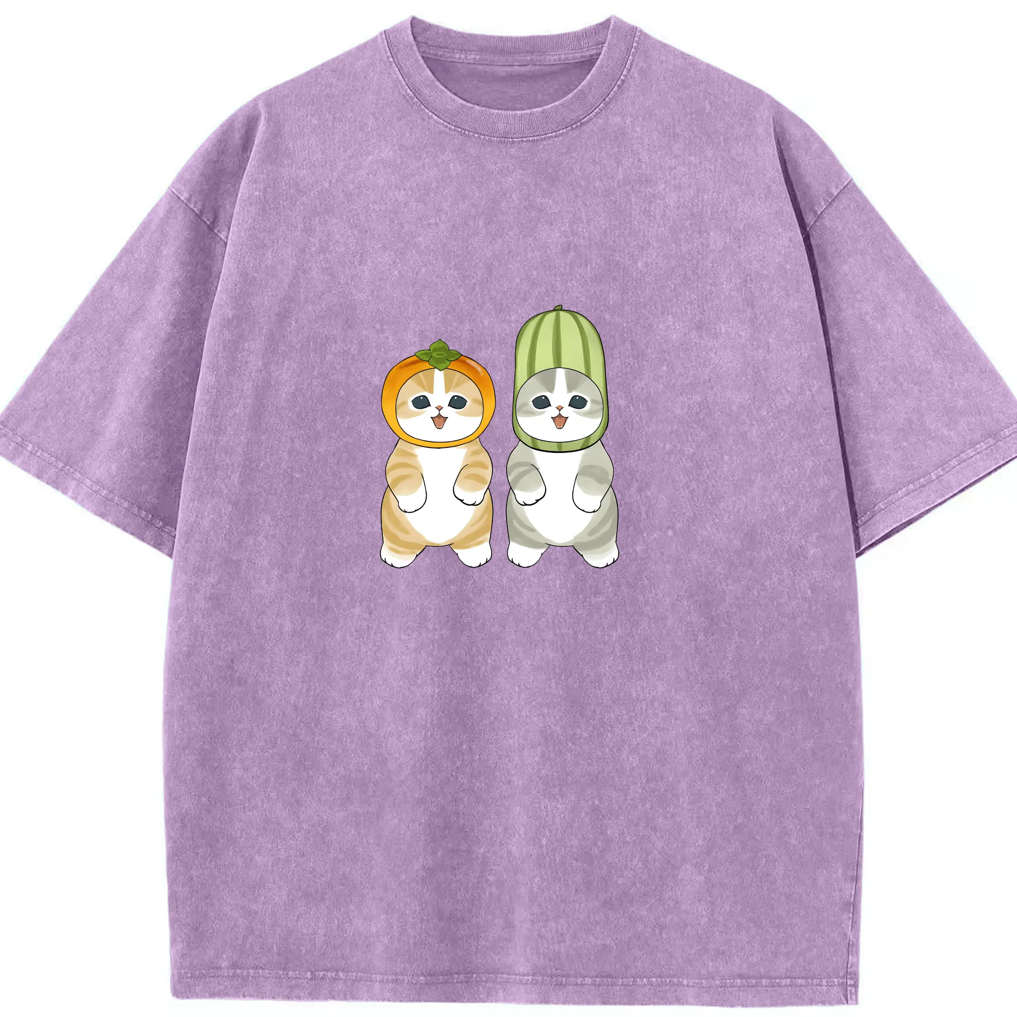 Mofusand柿とスイカ猫のユニーク - 綿100% 半袖Tシャツ ・ フロントプリント ・ 快適 通気性 ・ 日常使い 散歩 スポーツ用