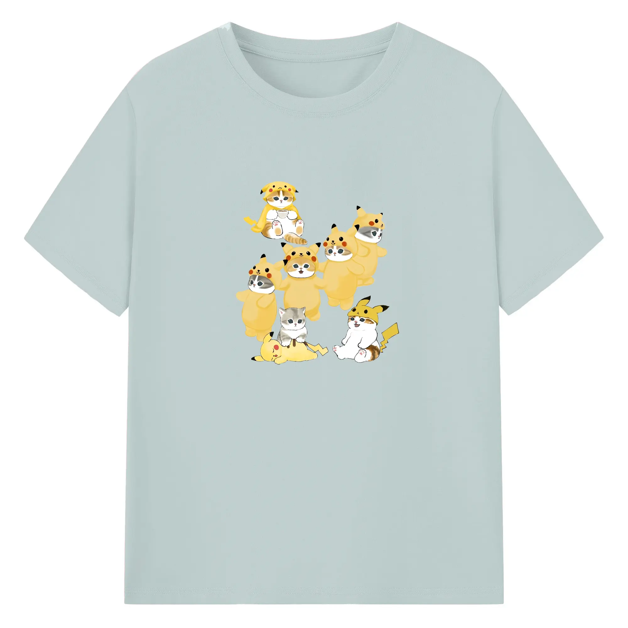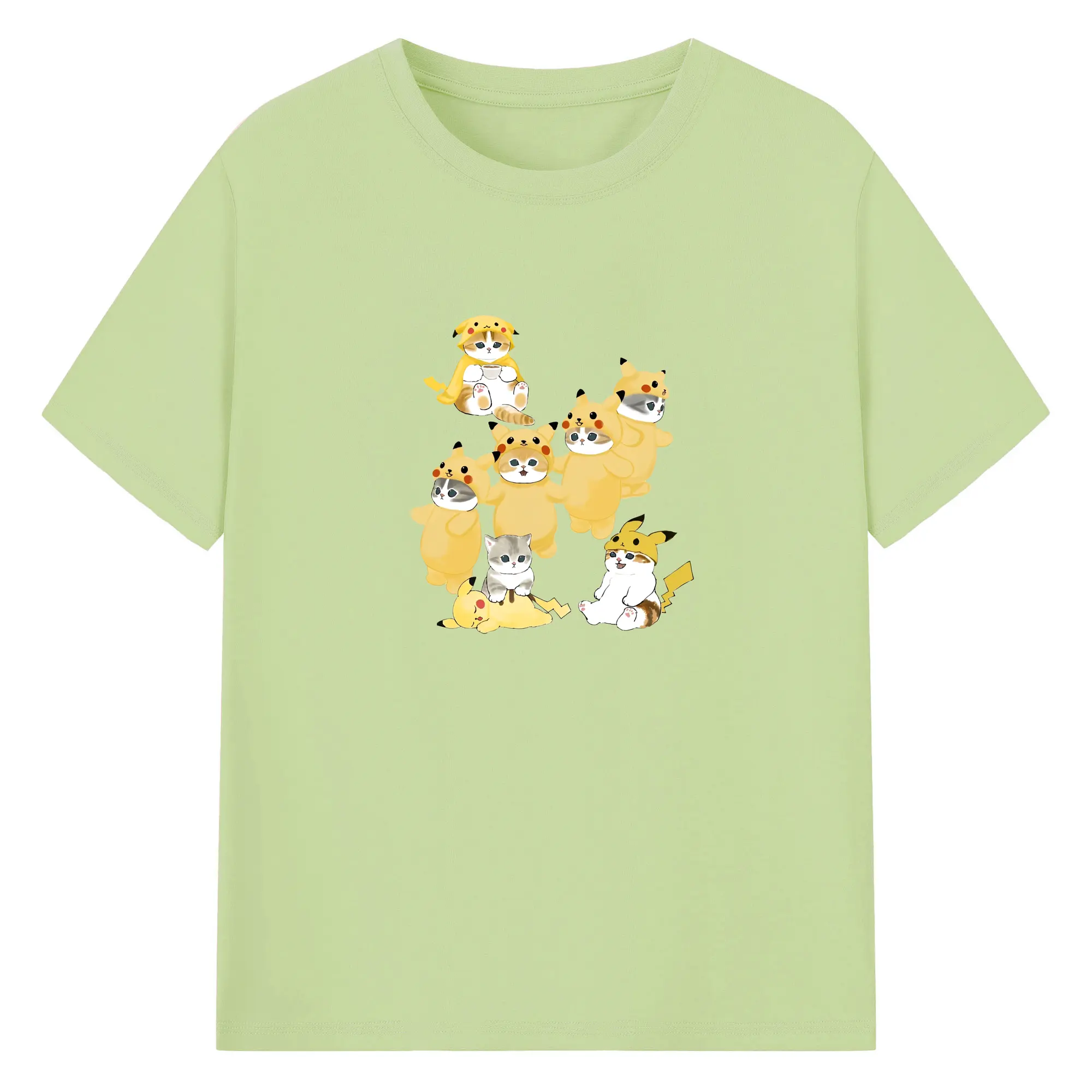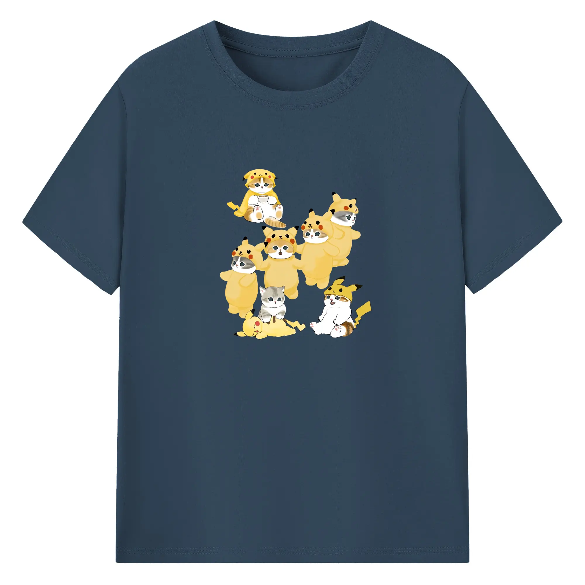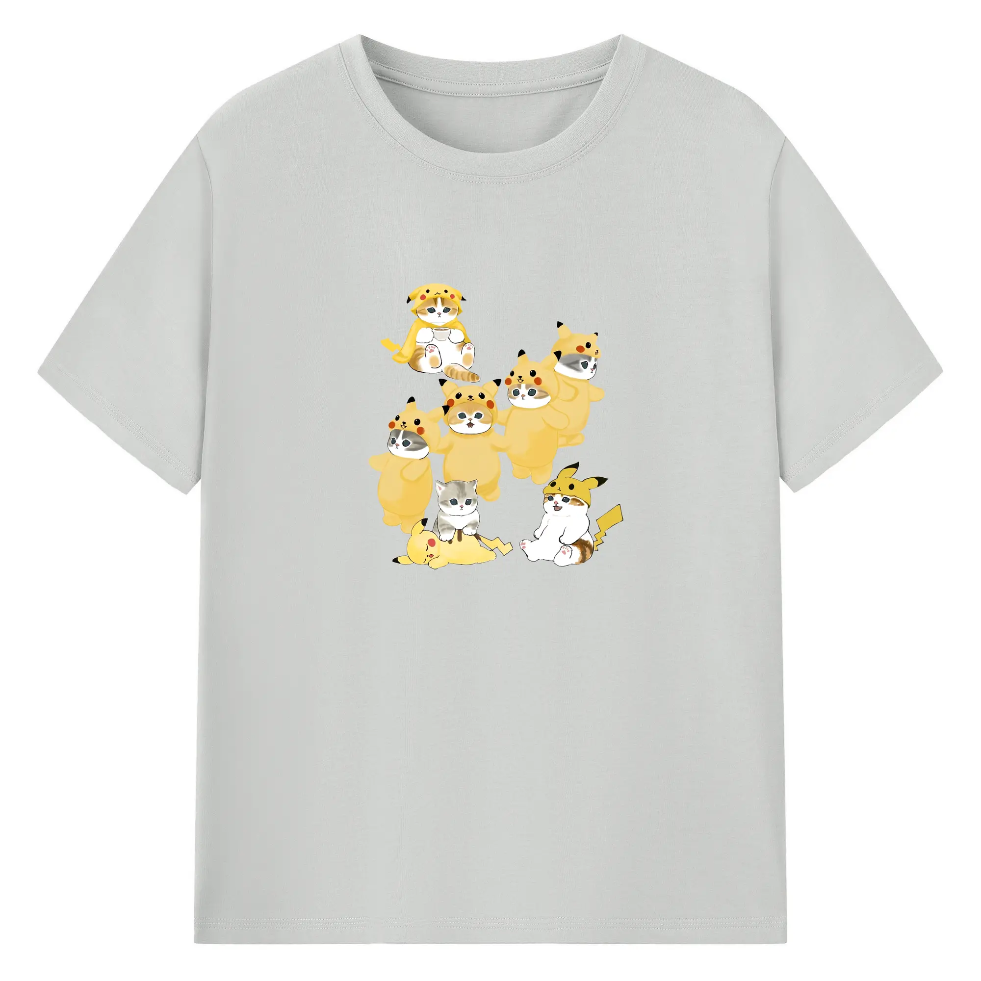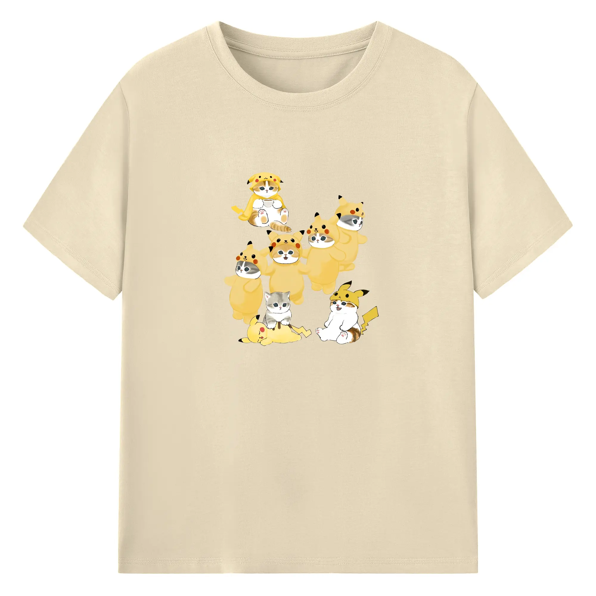Mofusand × ピカチュウ コラ限定ボ - 綿100% ヴィンテージ風 半袖Tシャツ ・ フロントプリント ・ 柔らか肌触り ・ 通気性 快適 ・ スポーツ カジュアル 外出用