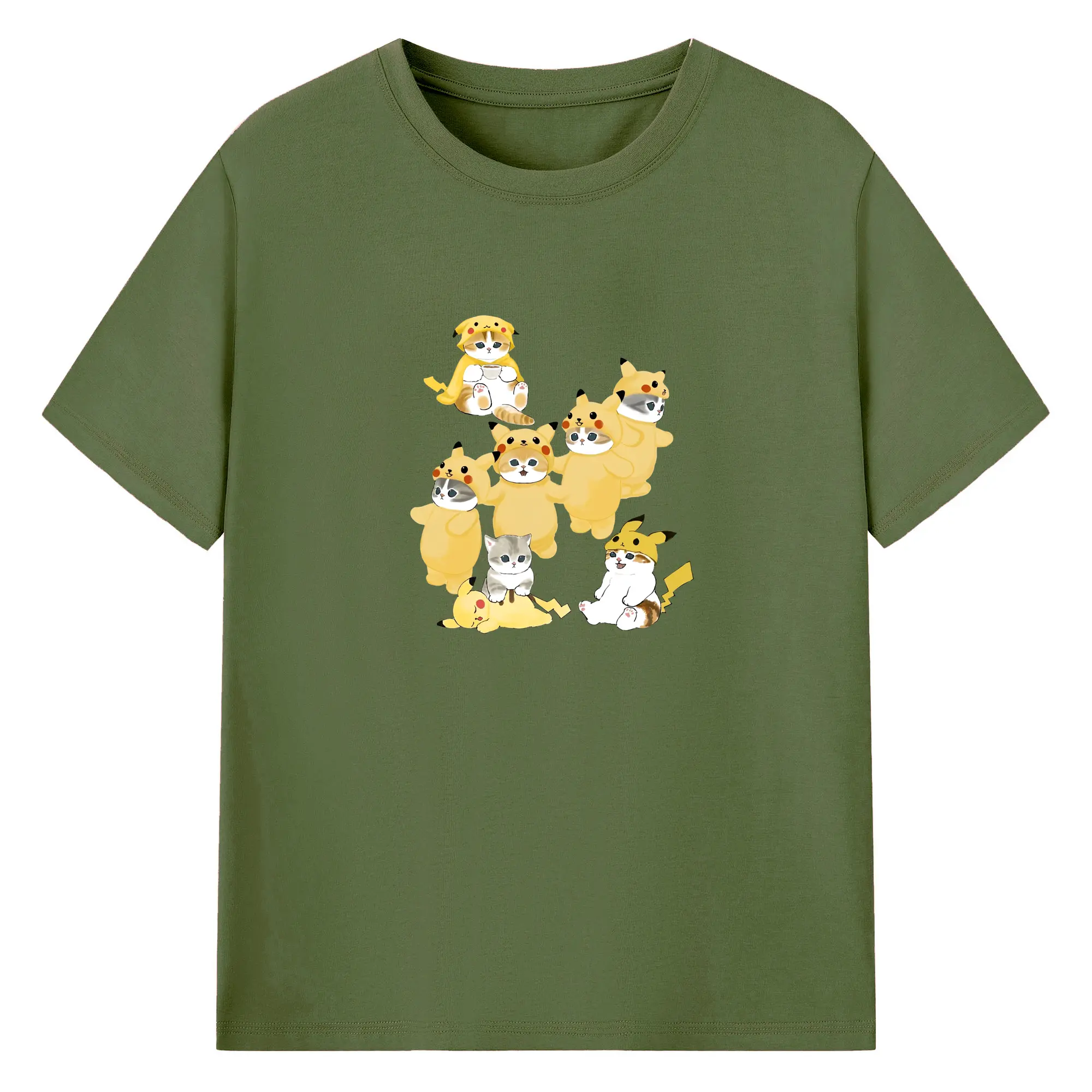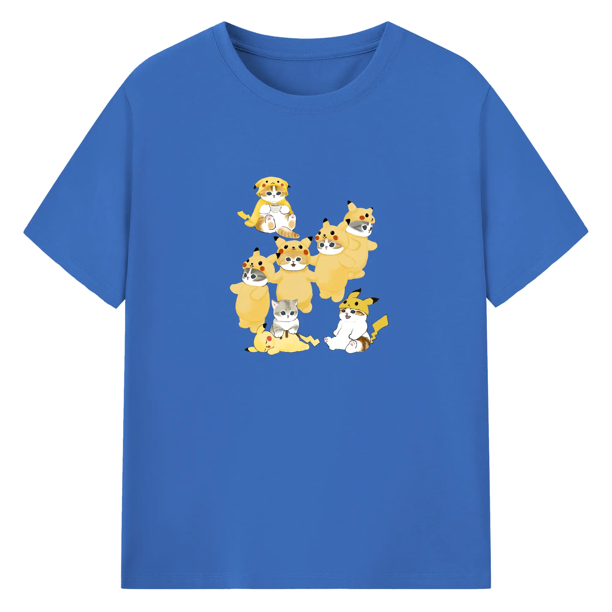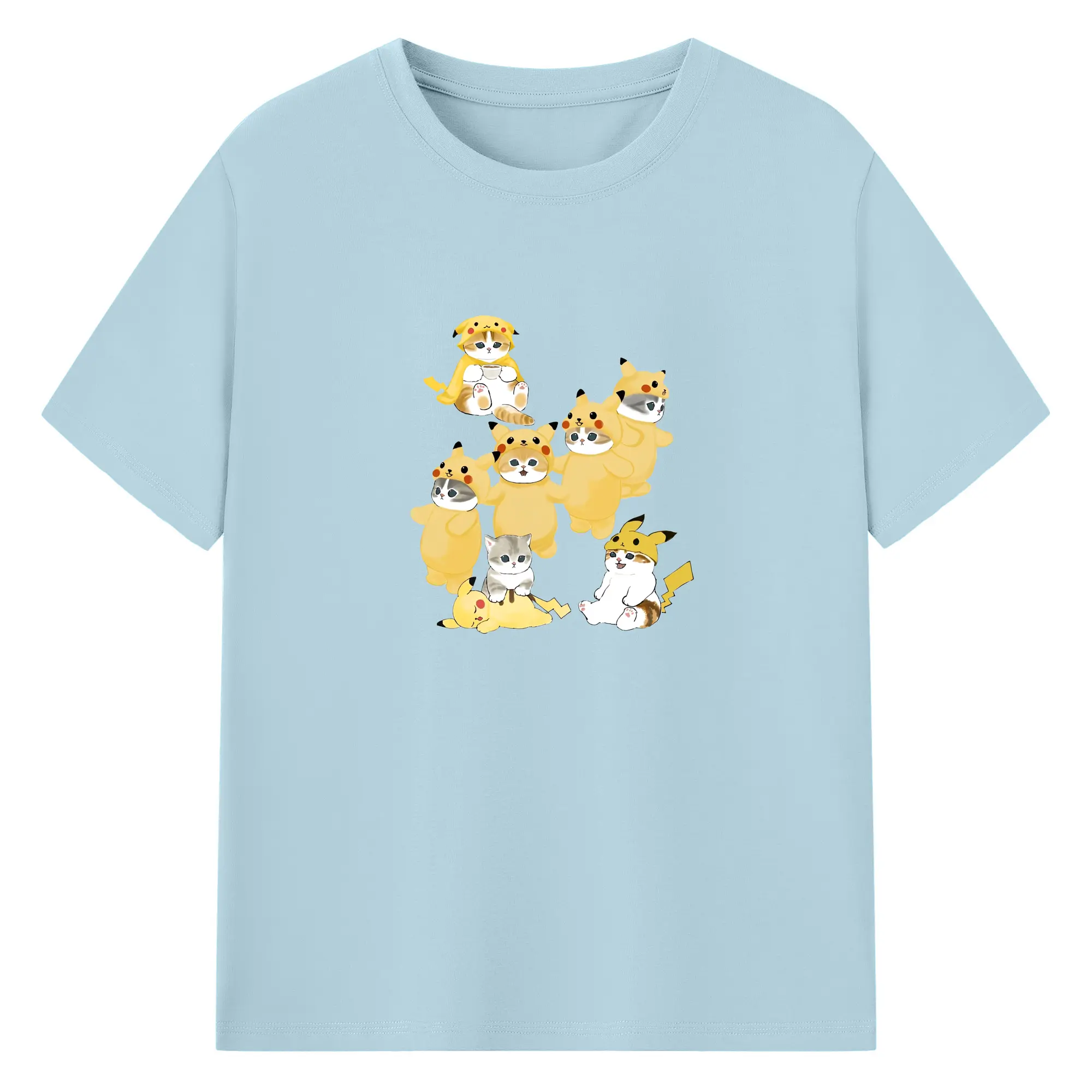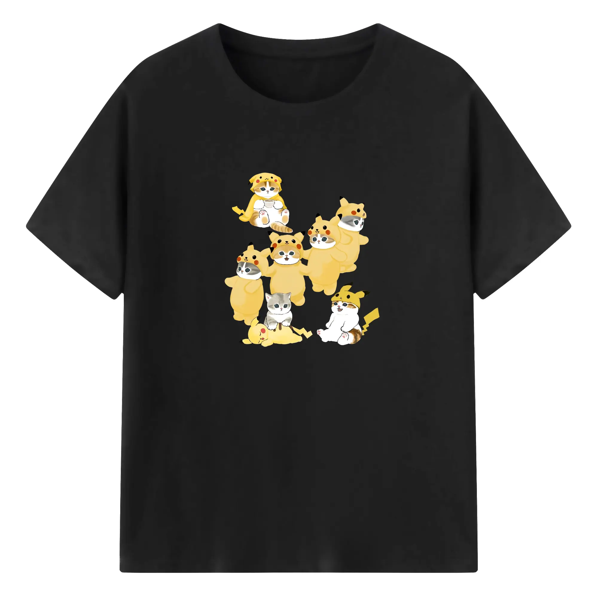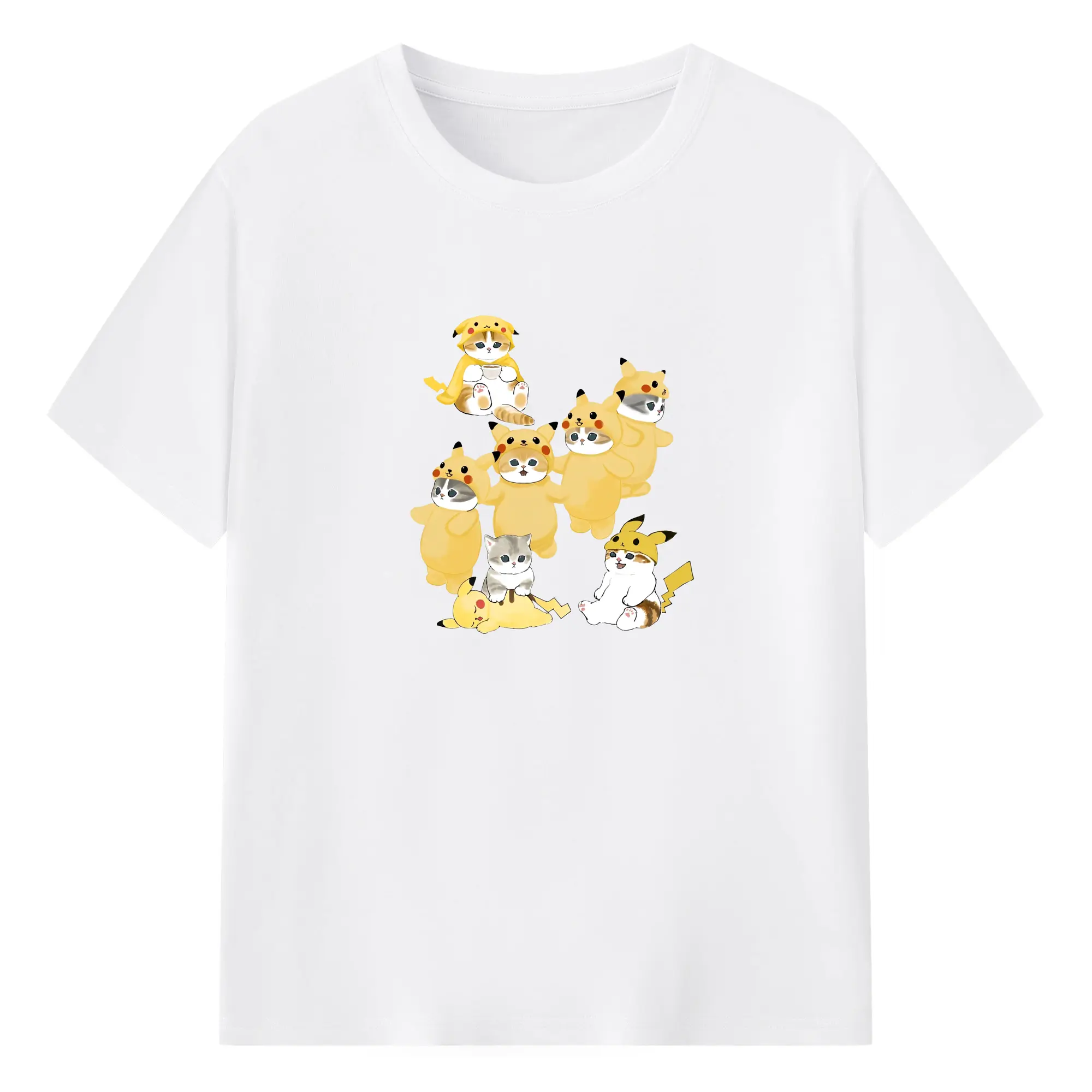 Mofusand × ピカチュウ コラ限定ボ - 綿100% ヴィンテージ風 半袖Tシャツ ・ フロントプリント ・ 柔らか肌触り ・ 通気性 快適 ・ スポーツ カジュアル 外出用