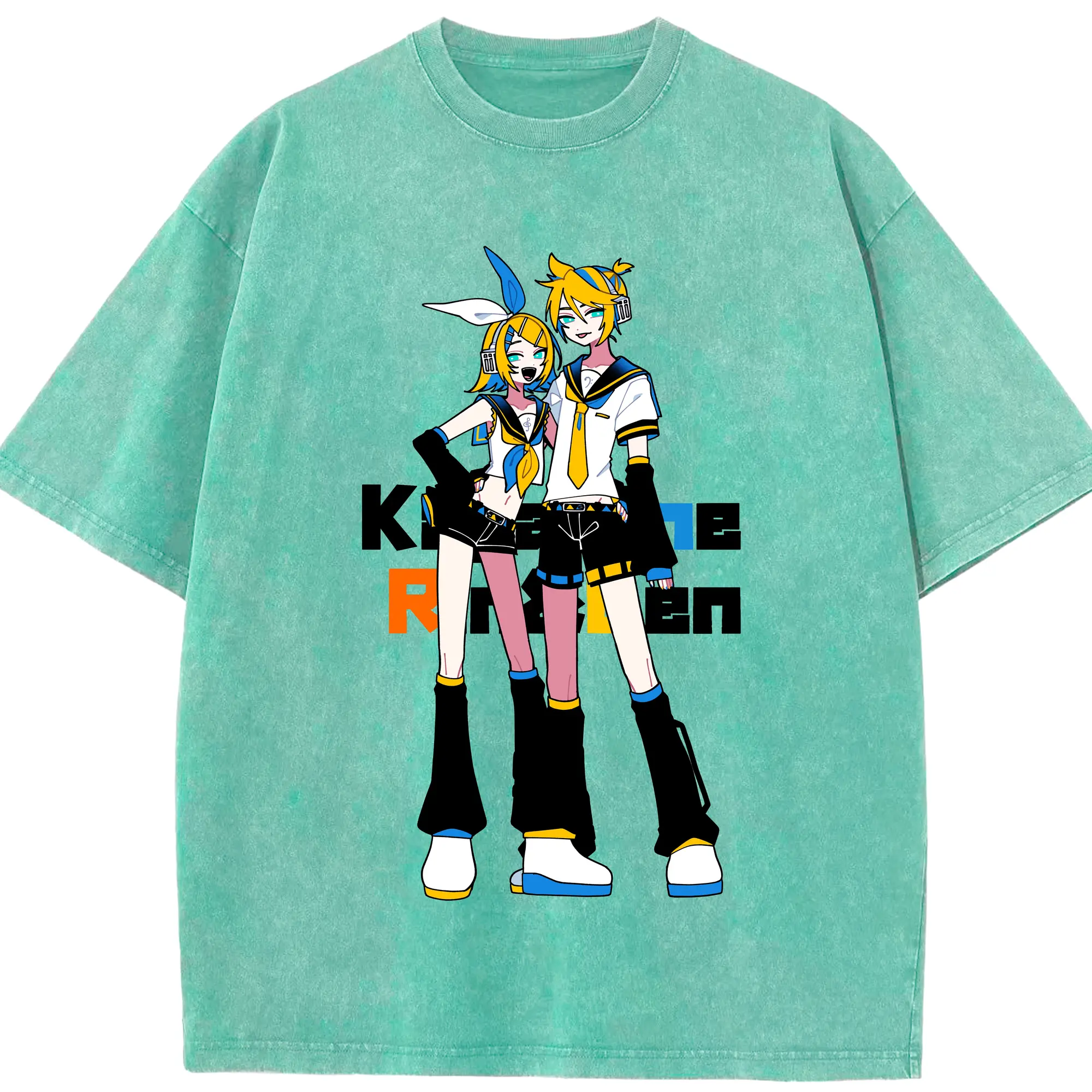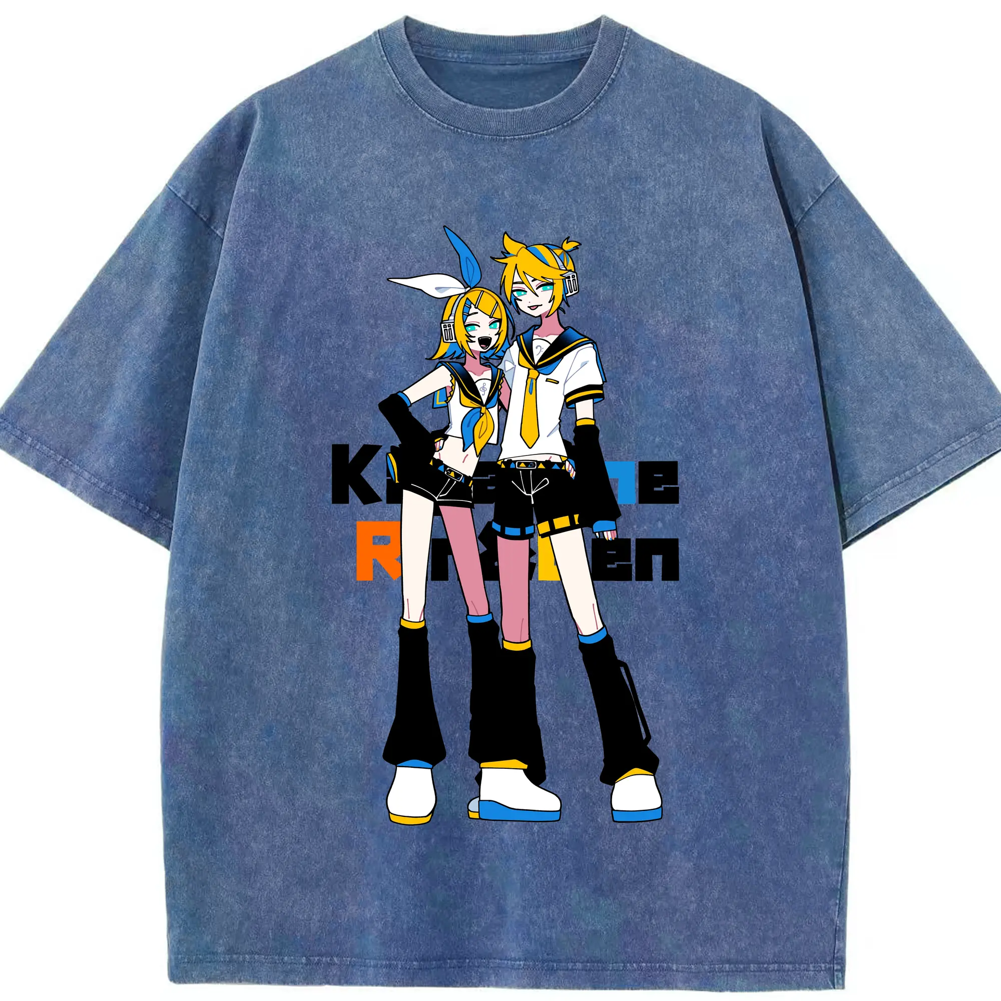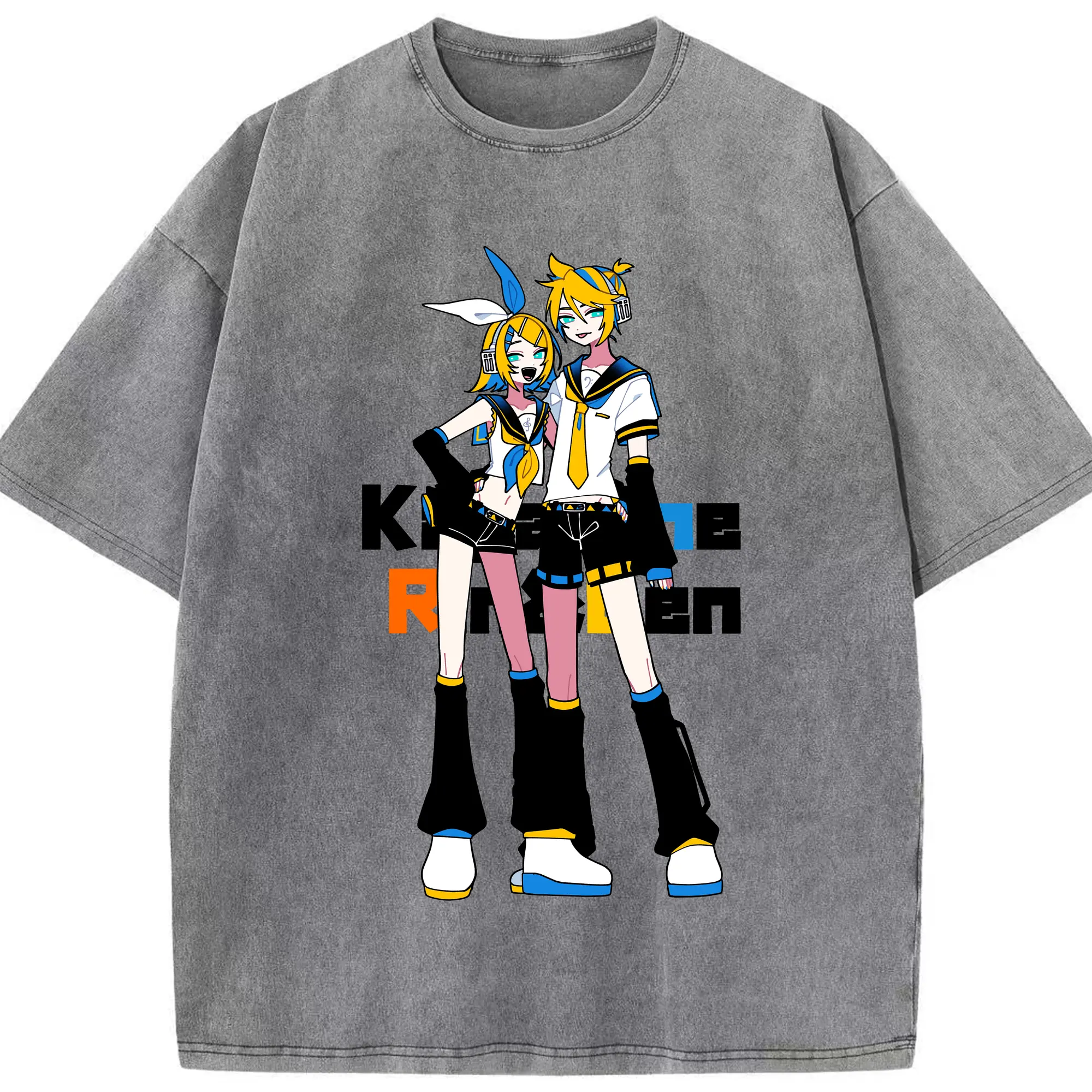 VOCALOID 鏡音リン・レン - 綿100% ヴィンテージ風 半袖Tシャツ ・ フロントプリント ・ 柔らか肌触り ・ 通気性 快適 ・ スポーツ カジュアル 外出用