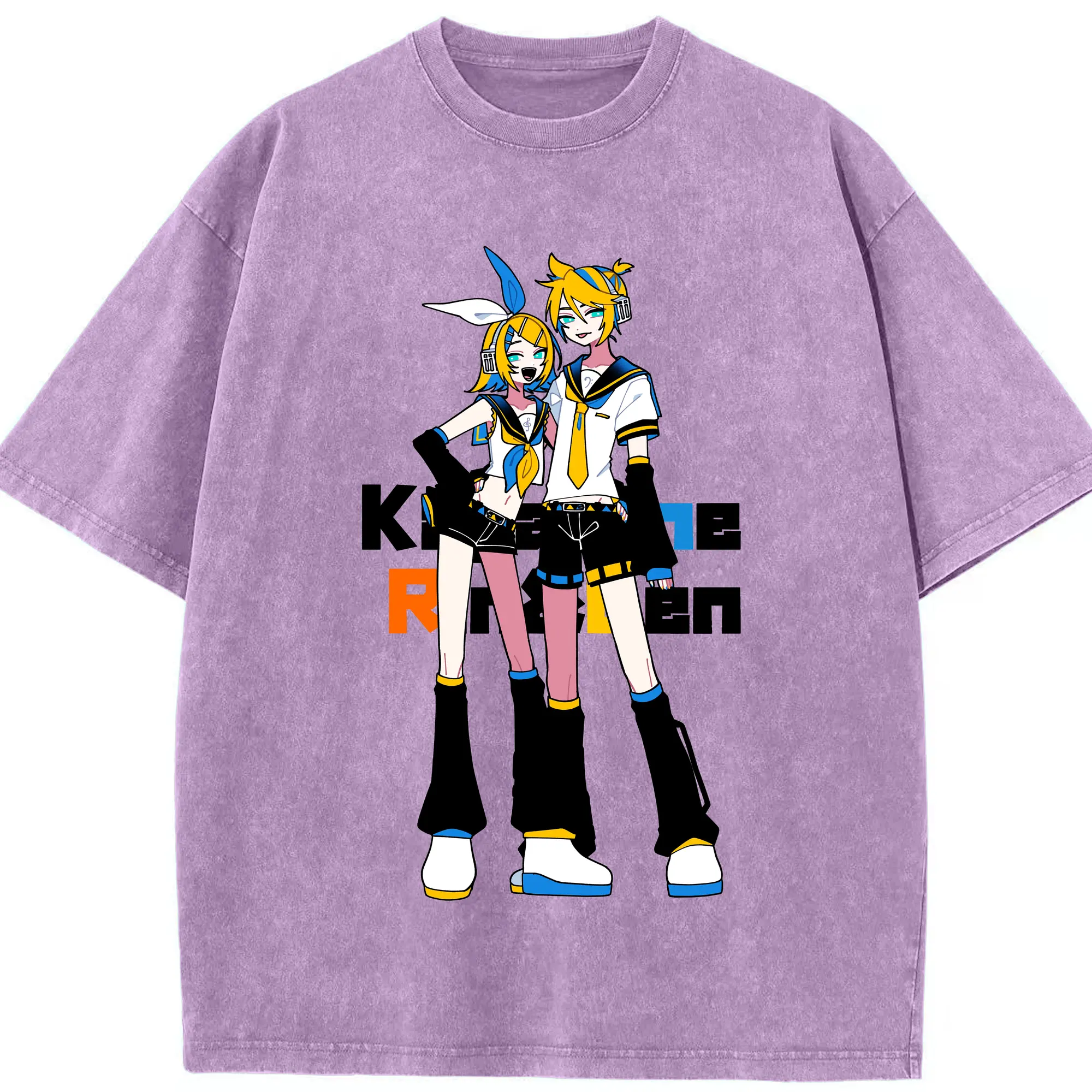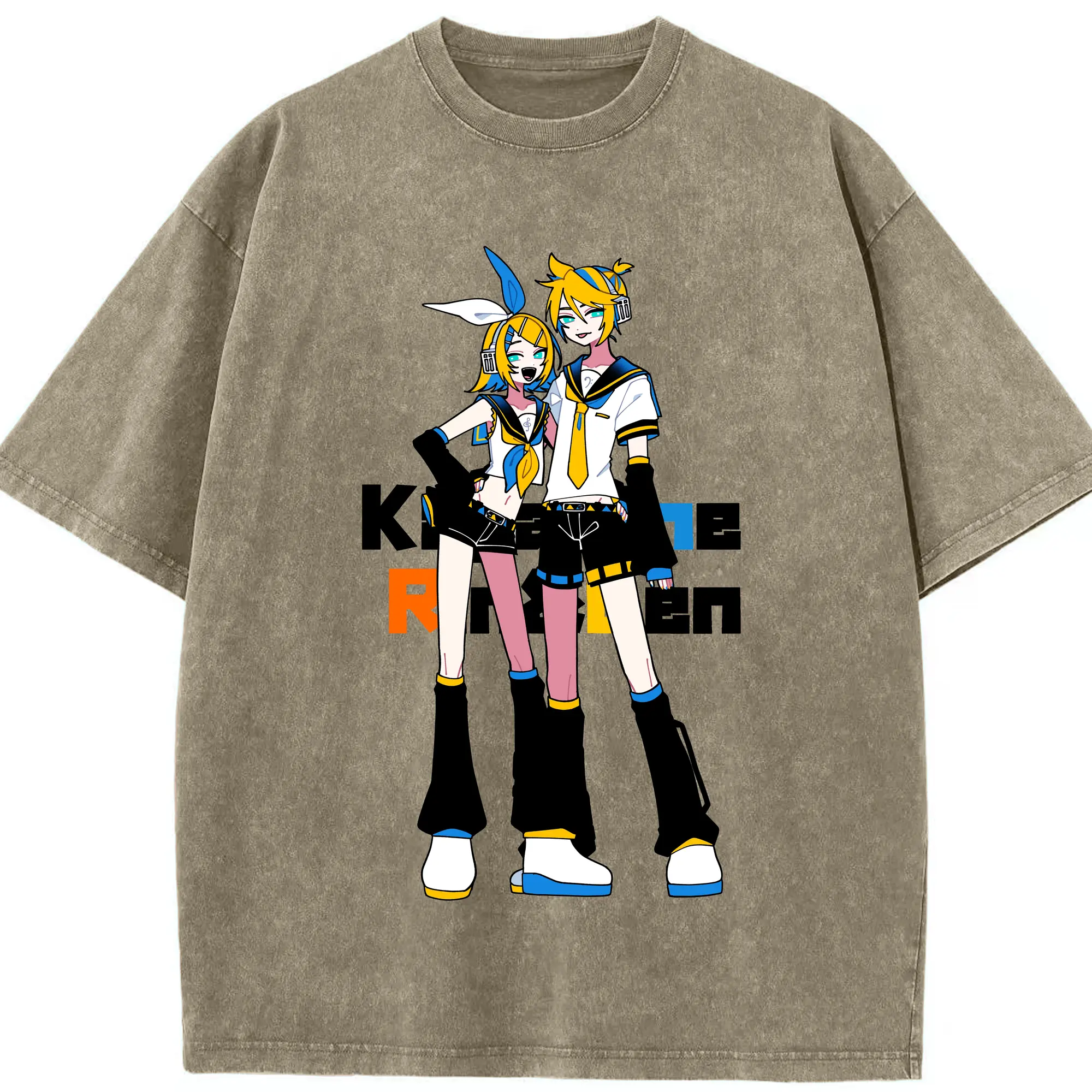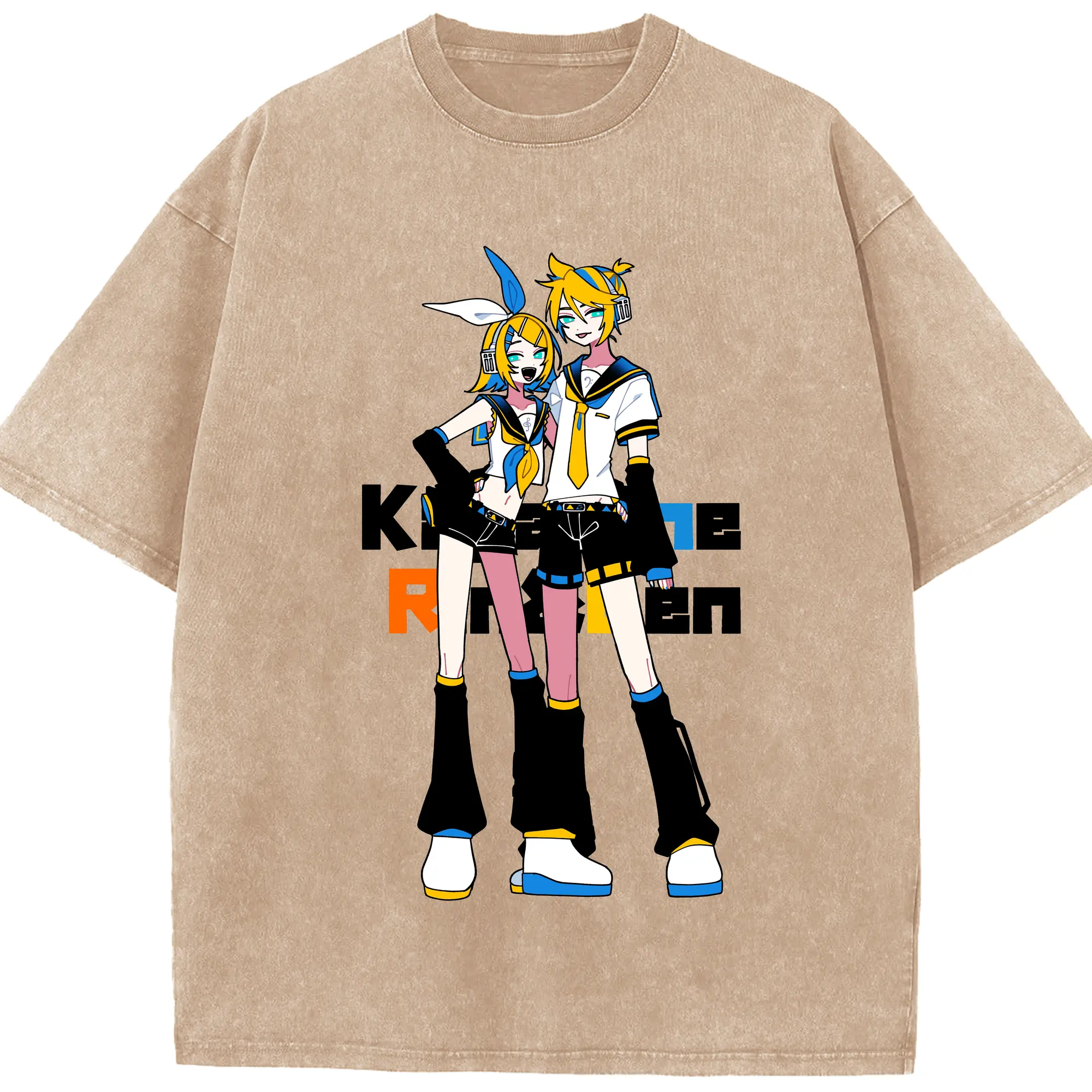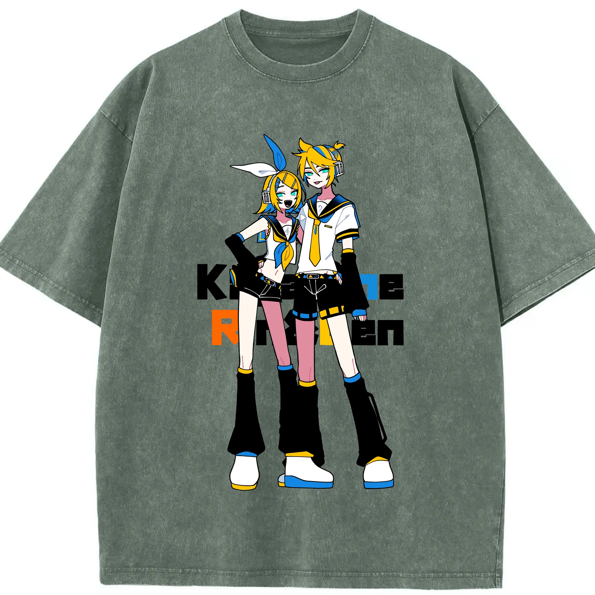 VOCALOID 鏡音リン・レン - 綿100% ヴィンテージ風 半袖Tシャツ ・ フロントプリント ・ 柔らか肌触り ・ 通気性 快適 ・ スポーツ カジュアル 外出用